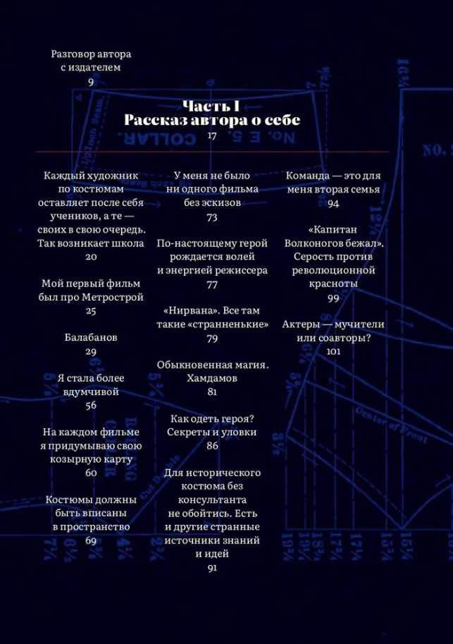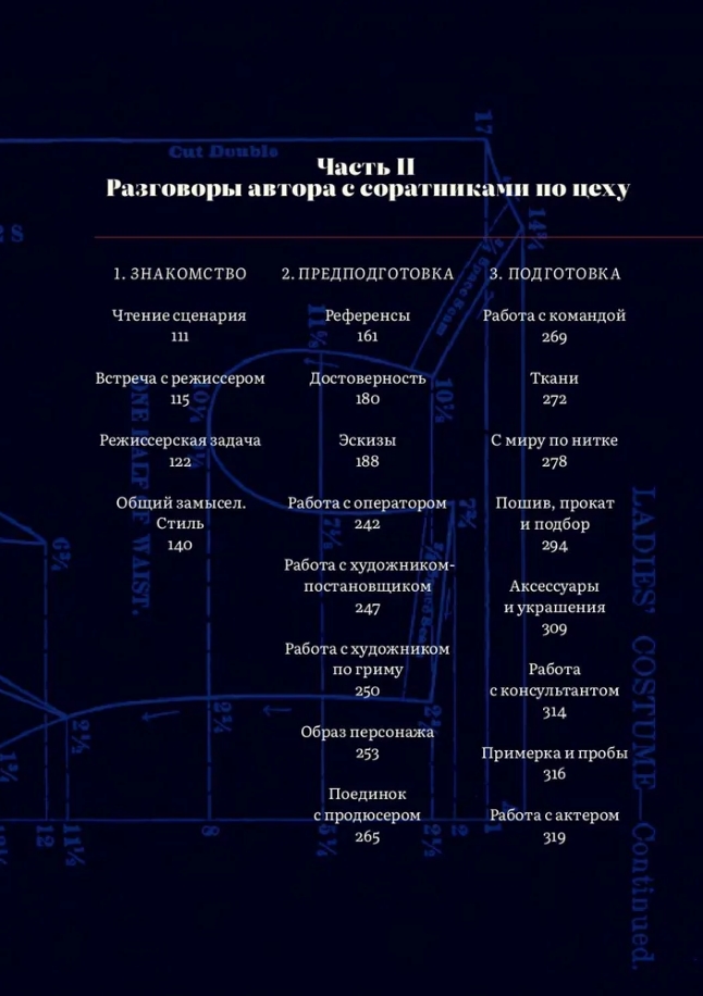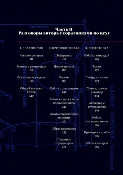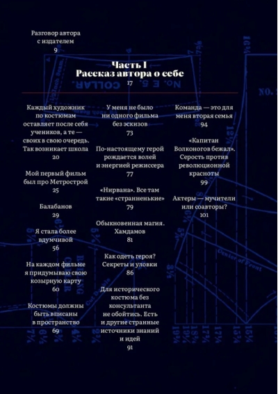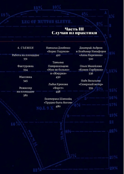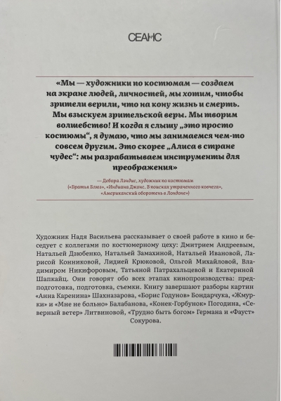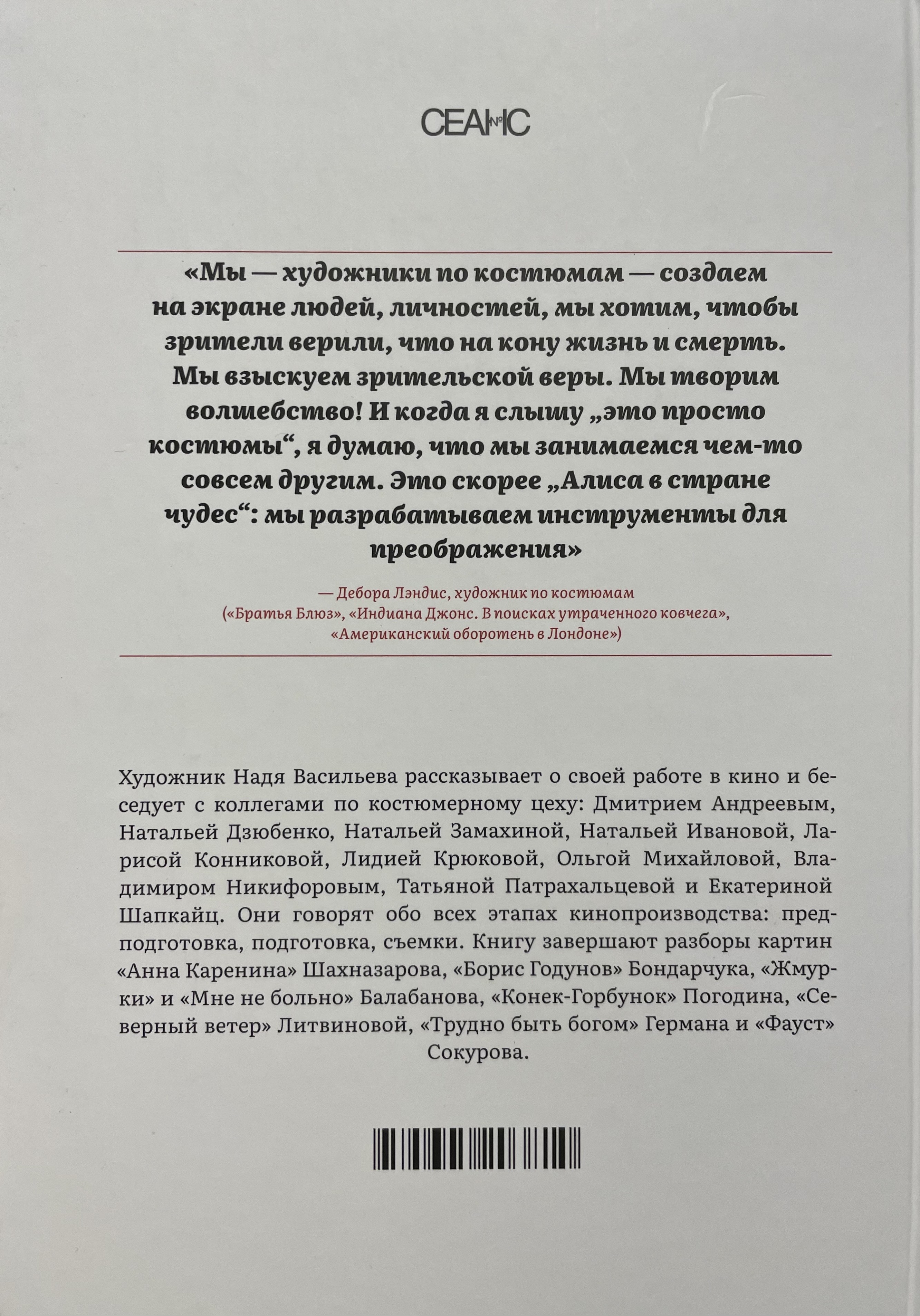 Nadya Vasilyeva, a Russian artist, talks about her work in cinema and interviews ten colleagues from the costume department: Dmitry Andreyev, Natalya Dzyubenko, Natalya Zamakhina, Natalya Ivanova, Larisa Konnikova, Lidiya Kryukova, Olga Mikhailova, Vladimir Nikiforov, Tatyana Patrakhaltseva and Ekaterina Shapkaits. Their thoughts on the profession are collected in sections corresponding to the stages of film production. The book concludes with analyses of individual films: Anna Karenina by Shakhnazarov, Boris Godunov by Bondarchuk, Zhmurki and Mne Ne bol'no by Balabanov, The Little Humpbacked Horse by Pogodin, The North Wind by Litvinova, Hard to Be a God by German and Faust by Sokurov.