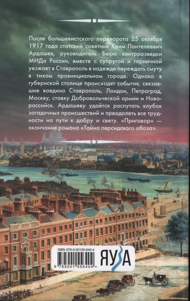 After the Bolshevik coup of October 25, 1917, State Councillor Klim Panteleyevich Ardashev, head of the Counterintelligence Bureau of the Russian Foreign Ministry, leaves for Stavropol with his wife and maid, hoping to wait out the turmoil in the quiet provincial city. However, events occur in the provincial capital, linking Stavropol, London, Petrograd, Moscow, the Volunteer Army and Novorossiysk. Ardashev manages to untangle the tangle of mysterious incidents and overcome all the difficulties on the way to good and light. "Sentence" - the end of the novel "The Mystery of the Persian wagon".