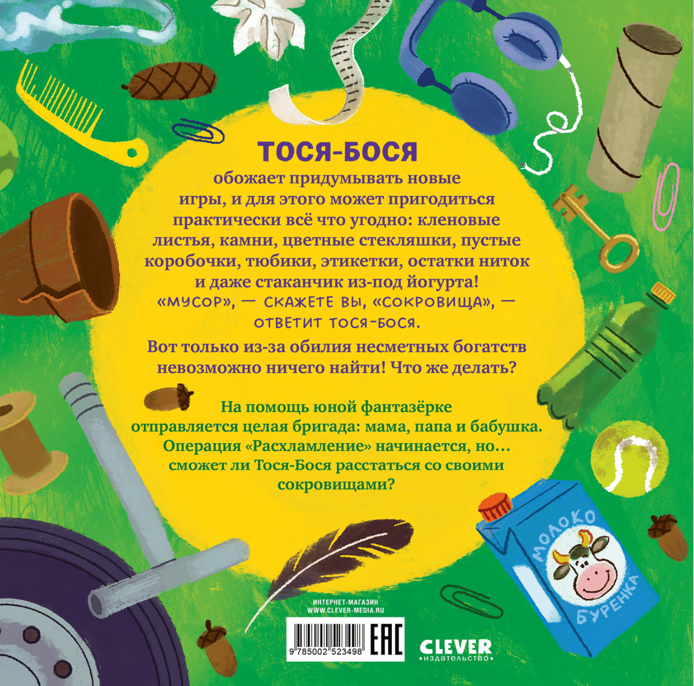 Tosya-Bosya loves to invent new games, and almost anything can be used for this: maple leaves, boxes, tubes, labels, scraps of thread. "Trash," you say. "Treasure," Tosya-Bosya will answer. But due to the abundance of countless riches, it's impossible to find anything! What to do? Will Tosya-Bosya be able to part with her treasures?