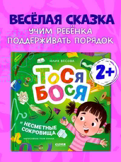 Clever Publishing House presents the cheerful picture book "Tosya-Bosya and Countless Treasures" by popular author Yulia Vesovaya. It features a captivating plot, a relatable heroine for children, funny illustrations, and an important topic for discussion with your child. You'll also find educational activities for girls and boys on the endpapers of this book for 3-year-olds.