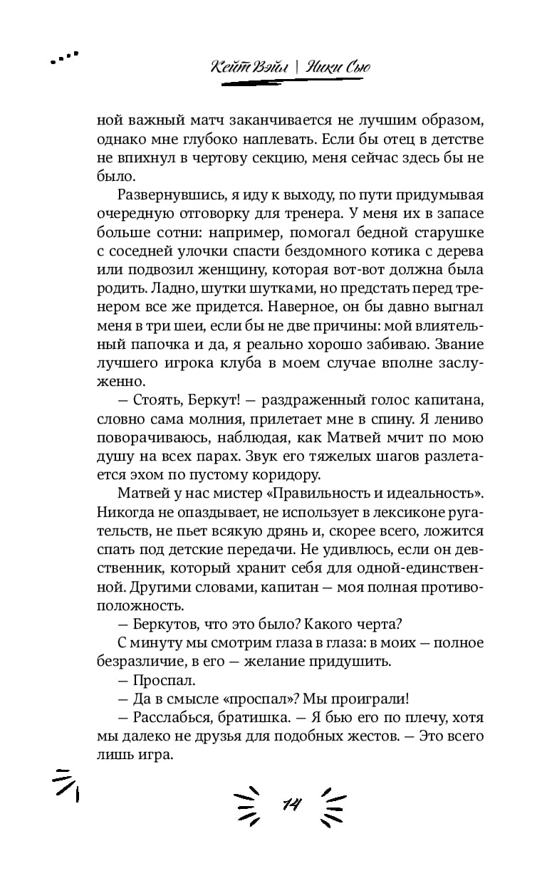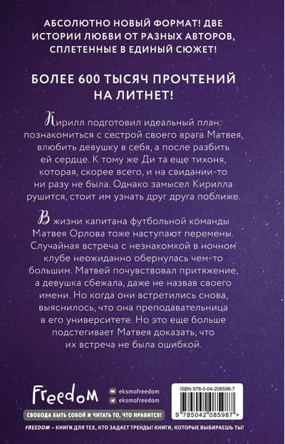 A completely new format from the popular writers of romantic prose Nicky Sue and Kate Vale! Two love stories woven into a single story! A real gift to fans of dramatic and passionate laustories, romances with heroes-athletes, stories in the scenery of the university, as well as the path “from enemies to lovers”! Sealed flyers with heroes and atmospheric layout with notes in the fields!