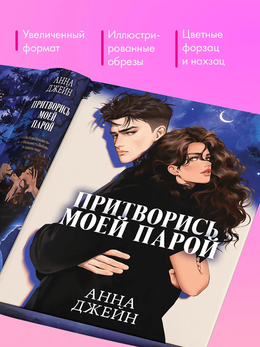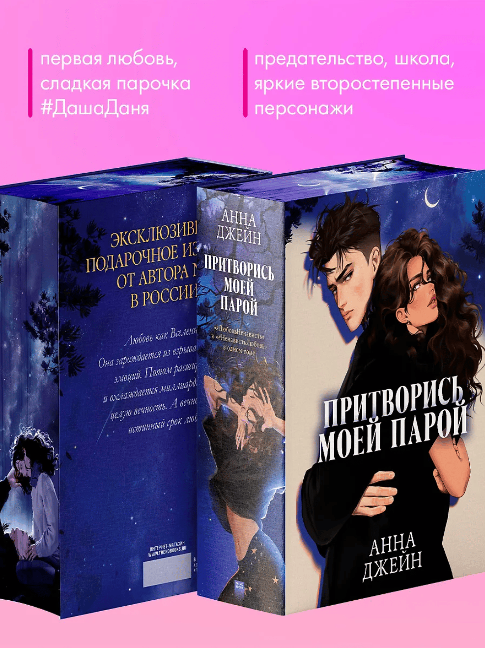 The "Pretend to Be My Love" duology is Anna Jane's bestseller, a vibrant story about first feelings and the first mistakes on the path to love. This comprehensive collection, combining the love novels "#LoveHate" and "#HateLove," with color illustrations by Karina Yashagina, illustrated edges, endpapers, and backpapers, will be a luxurious gift for all fans of Anna Jane's work.