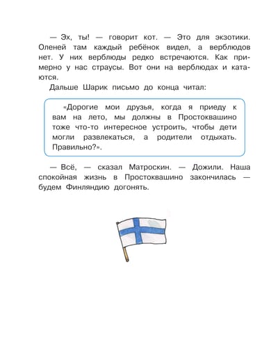Someone saw him, and they even wrote about it in the newspapers... And other residents of Prostokvashino weren't sitting idle either: the cat Matroskin decided to breed ostriches, and Pechkin bought a dog and named her Kashtanka.