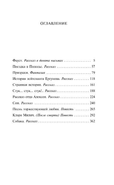 The collection includes the stories "Ghosts," "Faust," "Song of Triumphant Love," "Klara Milich (After Death)," and the short stories "A Trip to Polesie," "The Story of Lieutenant Ergunov," "A Strange Story," "Knock...Knock...Knock!..", "Father Alexei's Story," "Dream," and "The Dog."