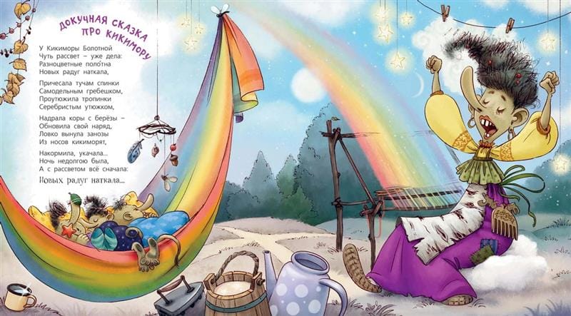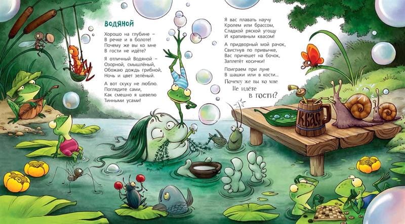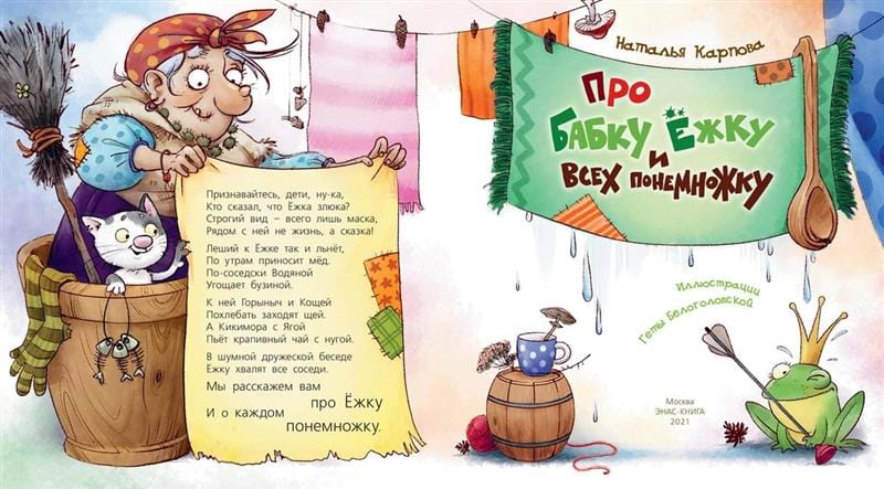 Babka Yezhka has long since taken no offense when people call her babka instead of babushka or babulenka - she is used to it. But she gets terribly upset when someone says that she is malicious, deceitful, unsociable and eats only good young men. "I can't think of such a thing!" - grumbles Yezhka, stirring the mushroom soup in a cast iron polished to a shine. She's expecting someone to visit her again. Our cheerful and mischievous Babka Yezhka has many friends: Vodyanoy, and Leshy, and even Koschey himself! You too will make friends with them, because all of them will meet you on the pages of this book. Cheerful poems about Babka Yezhka and her fairy-tale buddies were composed by Natalia Karpova, and all this marvelous company was drawn by Geta Belogolovskaya. For reading by adults to children. Artist Geta Belogolovskaya