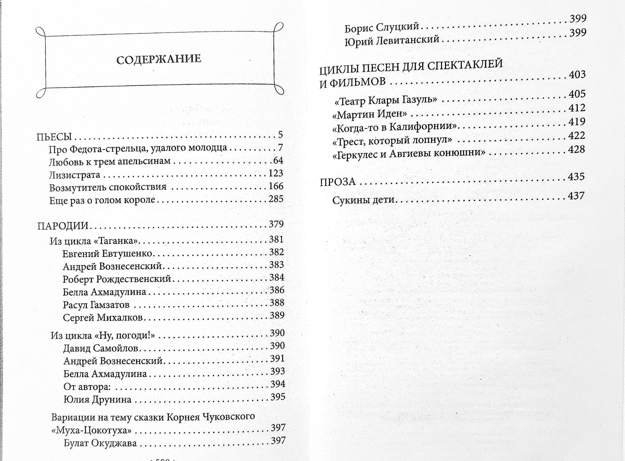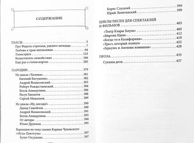 The collection also includes other plays ("The Love for Three Oranges," "Lysistrata," "The Troublemaker," "Once Again About the Naked Emperor"), poetic parodies of famous poets, a song cycle for plays and films, and the prose work "Sons of Bitches."