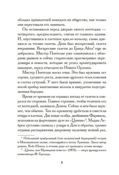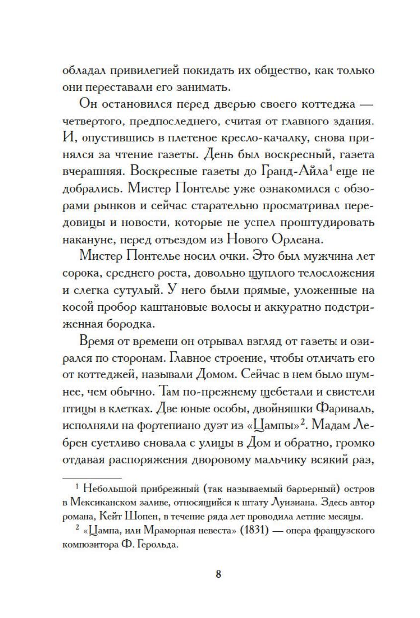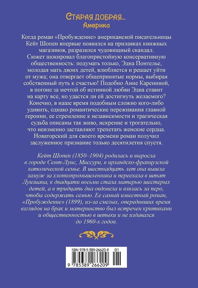 Louisiana, late 19th century. Edna and Leonce Pontellier are vacationing at a boarding house on the Gulf of Mexico with their two young children. Edna is a beauty and a smart woman, Leonce is a successful businessman. But a crack appears in the relationship of this seemingly ideal couple. Day after day, Edna finds more and more pleasure in communicating with Robert, the eldest son of the resort owner. Charming and helpful Robert is strikingly different from his taciturn, dry husband, and suddenly Edna realizes that she is madly in love. The young woman seems to awaken from the sleep of routine family life, completely surrendering to the power of new feelings. Sweet dreams, crazy hopes ... Edna is rushing things, striving towards her happiness. A happy future beckons, it seems so close ... In addition to the novel "Awakening", the collection includes magnificent stories by Kate Chopin - bright, intriguing stories from the lives of passionate American Creoles.