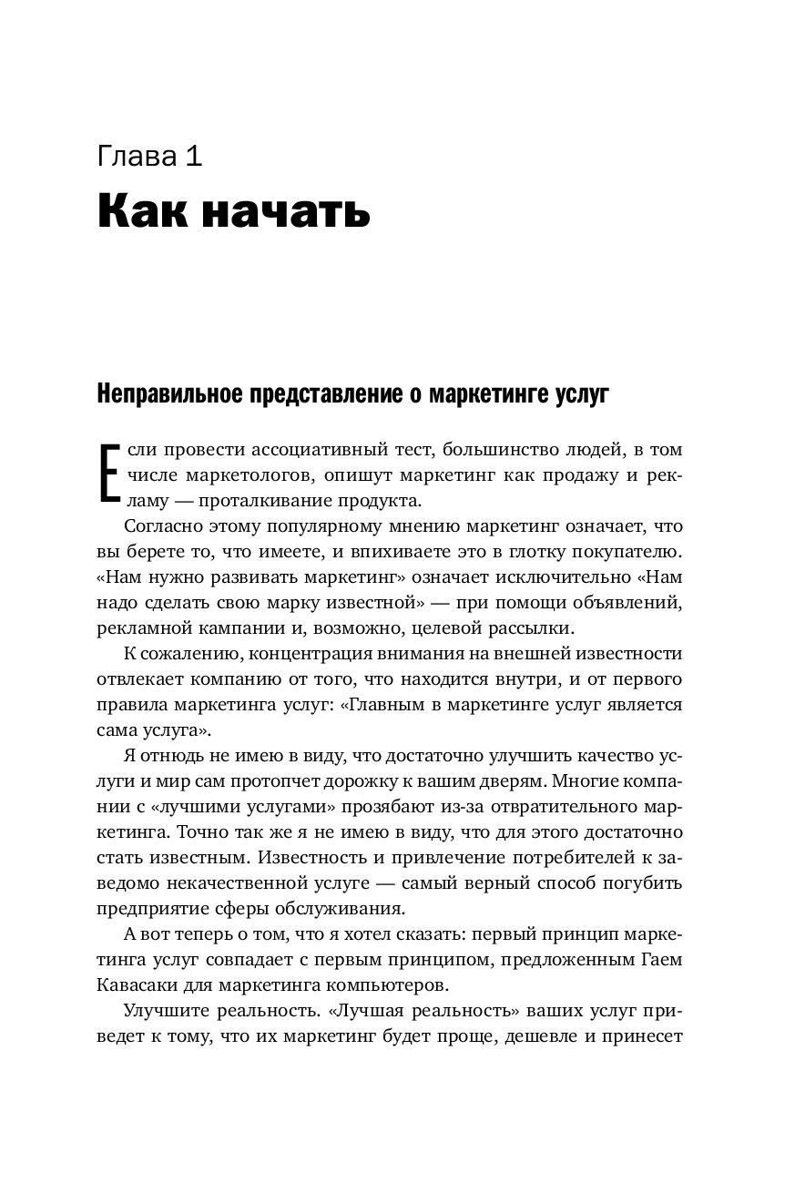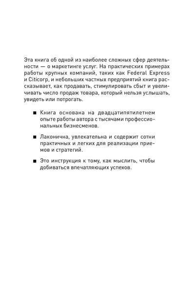 Marketing services is one of the most challenging areas of professional life. You can't touch, hear or see your company's core product. Then how do you organize sales and drive sales? Harry Beckwith's book, based on the author's twenty-five years of experience working with thousands of professional business people, brings marketing knowledge to readers through case studies of large companies, such as Federal Express and Citicorp, and small private businesses. The book is concise, engaging, and contains hundreds of practical and easy-to-implement techniques and strategies that are used in services marketing. It is aimed at service marketing professionals as well as students and professors of economics.