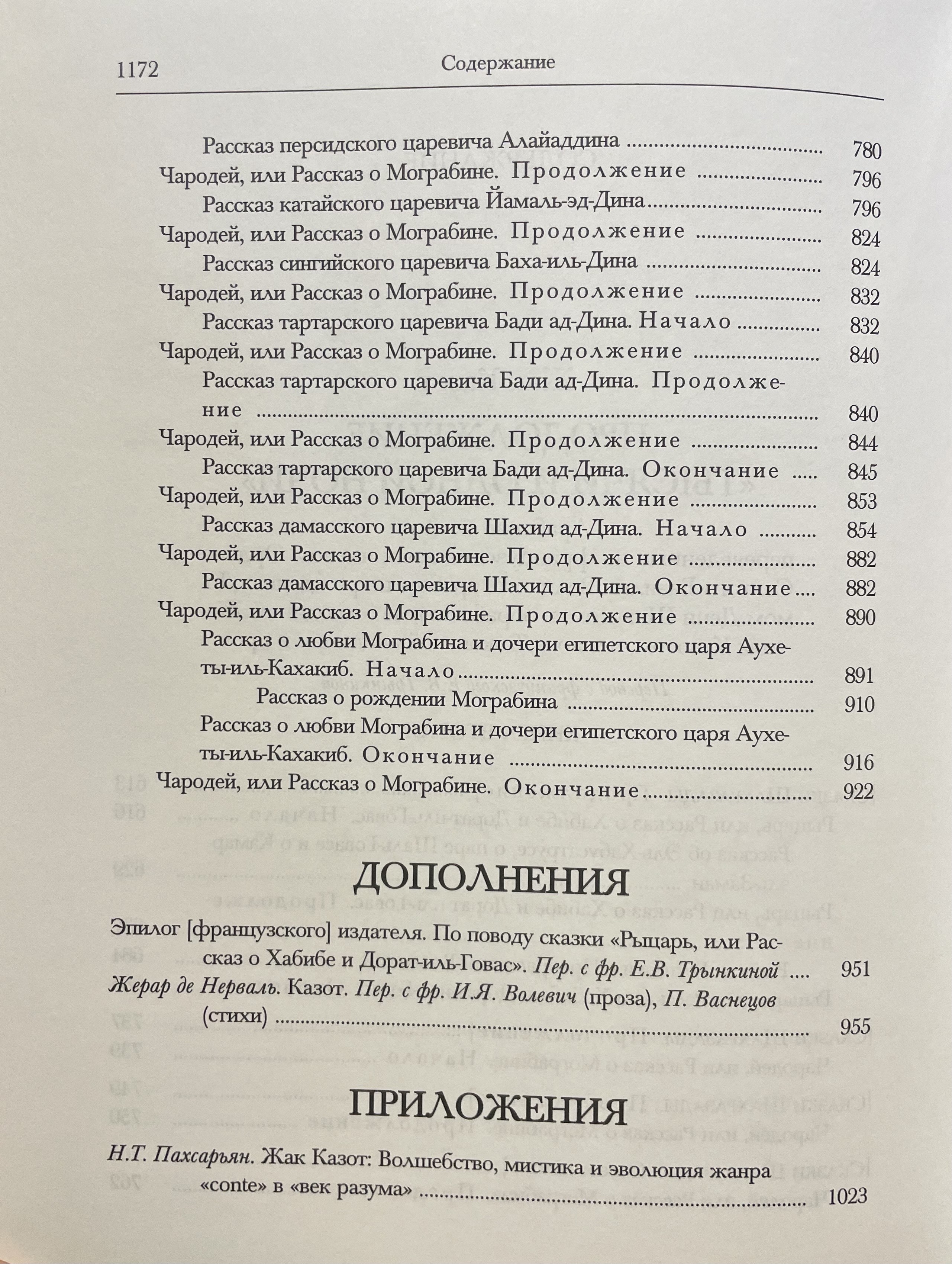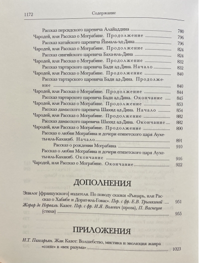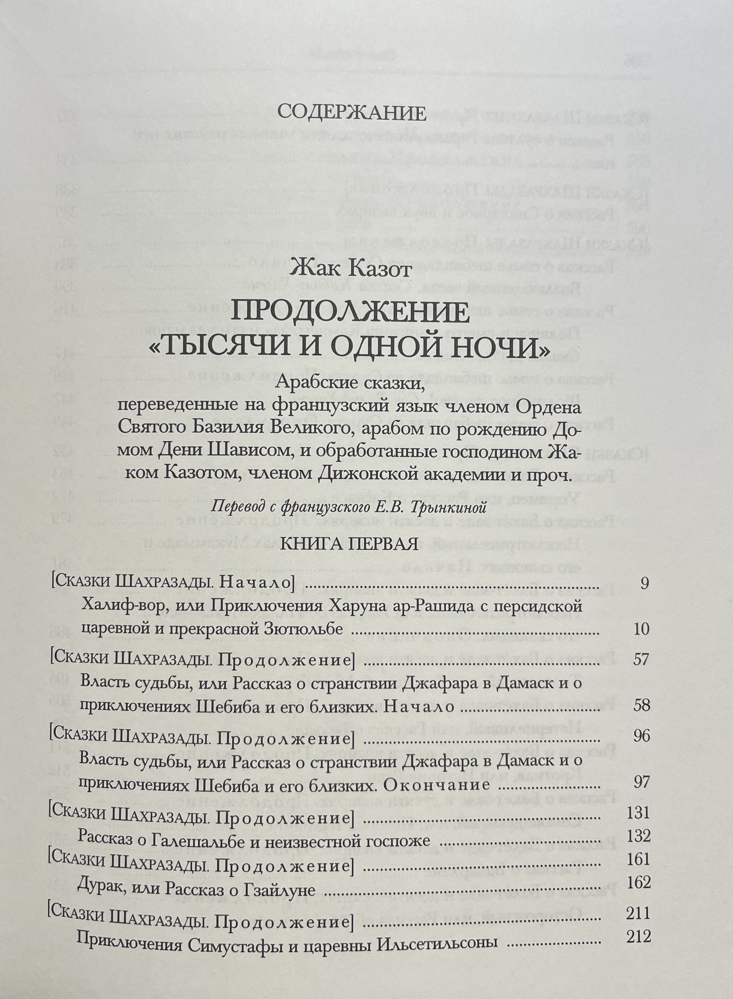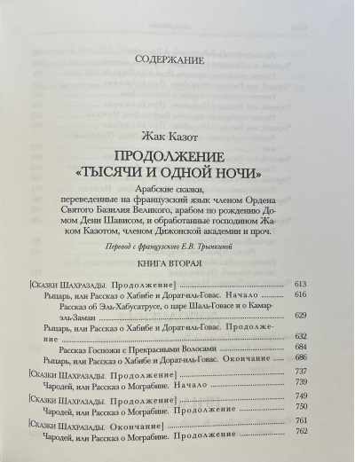 "The Continuation of One Thousand and One Nights" (1788-1789) is the final work by Jacques Cazotte (1719-1792), a French writer, mystic, Kabbalist, and Martinist, believed by his contemporaries to possess the gift of foresight. He gained popularity in Russia thanks to his famous Gothic fantasy fairy tale novel, The Devil in Love (published in 1772; in 1967, it was published in the Literary Monuments series as part of the collection Fantastic Stories).