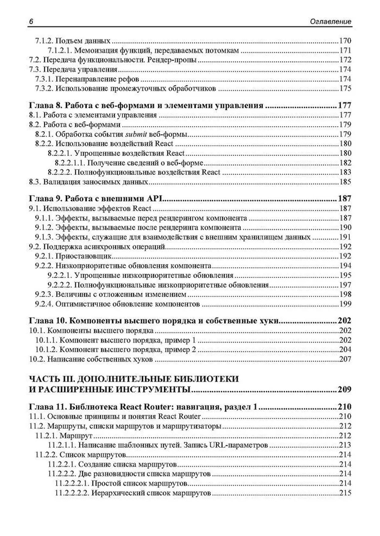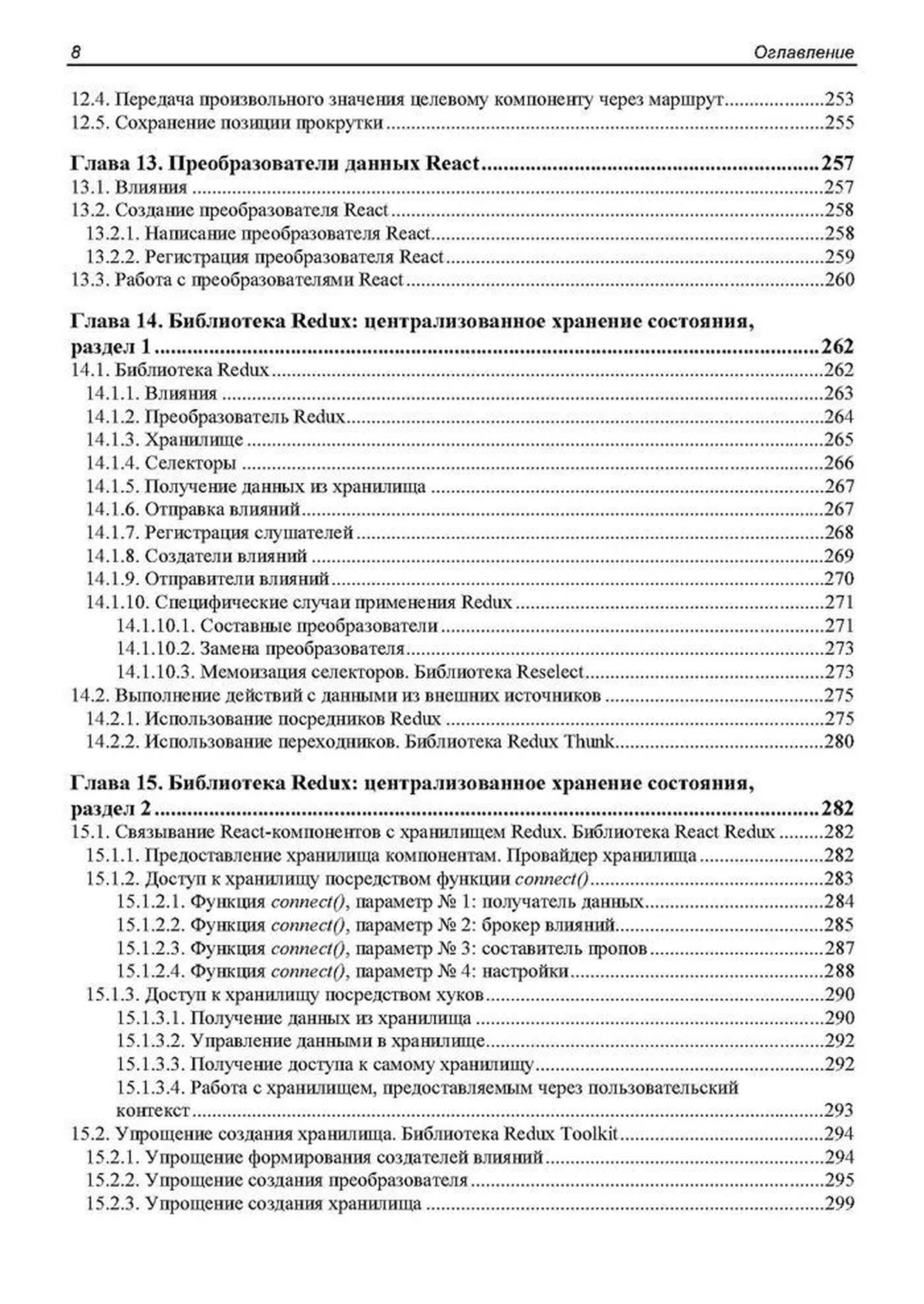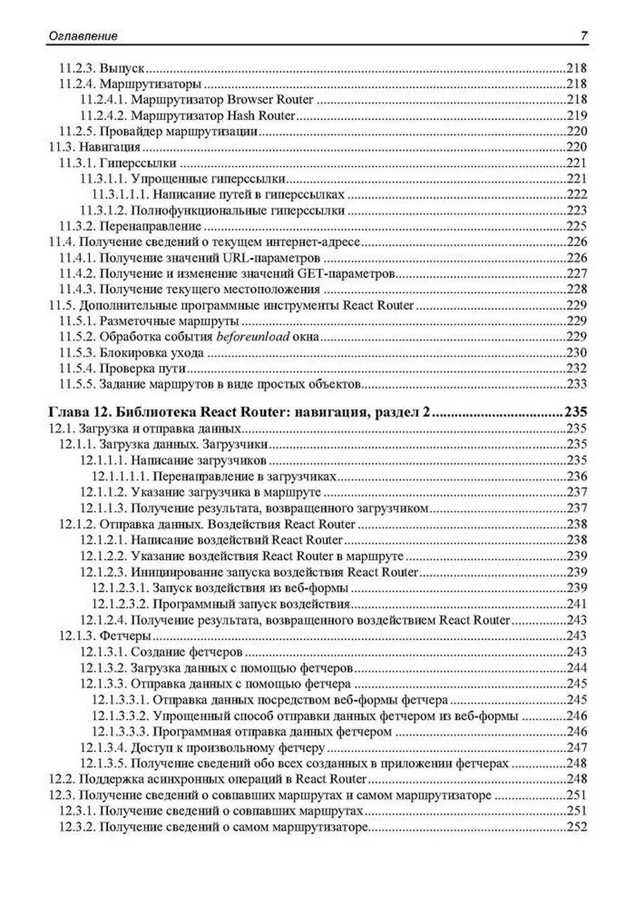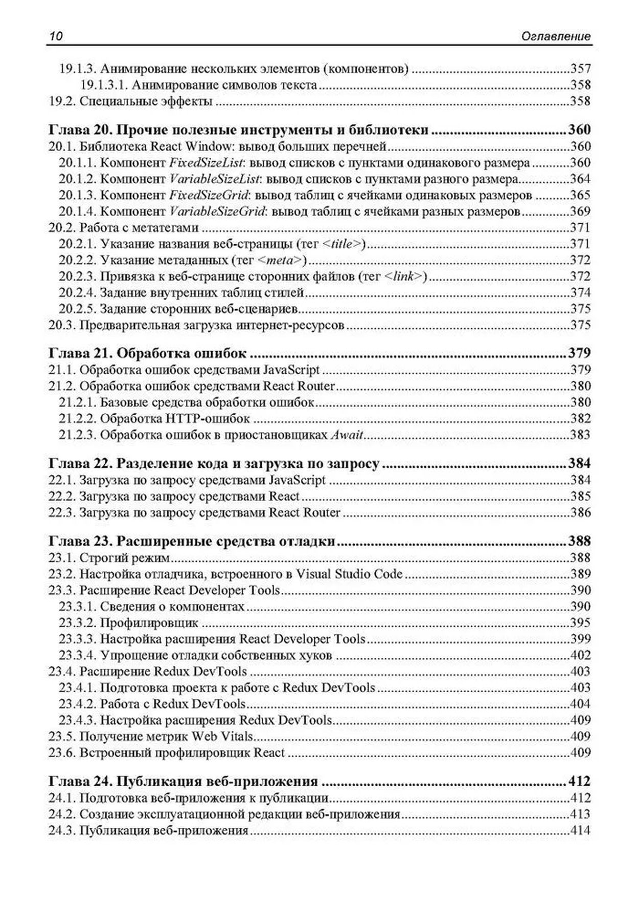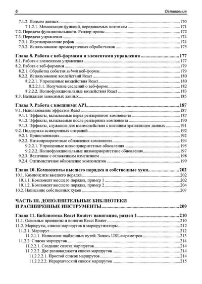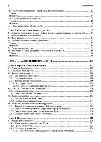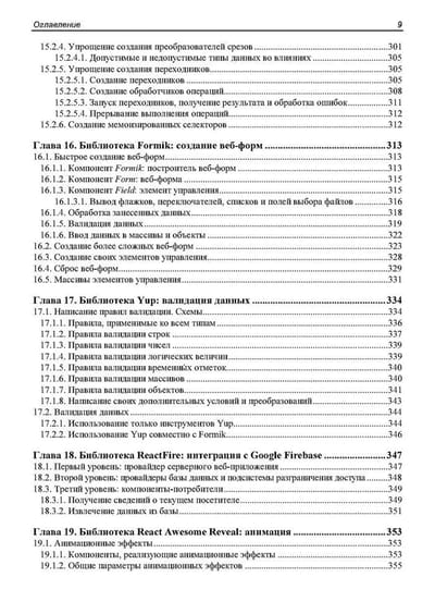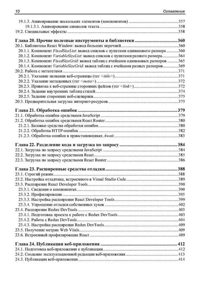 The book is devoted to programming web applications in JavaScript using the popular web framework React. It provides an introductory course that clearly describes step-by-step the development of a simple web application - a list of planned tasks. It describes basic tools: creating and configuring a React project, writing components, the JSX language, passing data between components and creating web forms. It covers useful additional libraries: React Router (navigation), Redux, React Redux and Redux Toolkit (centralized data storage), Formik (rapid development of web forms), Yup (validation), React Reveal (animation effects), etc. It talks about code splitting, error handling, debugging tools, publishing a finished web application and server-side rendering.