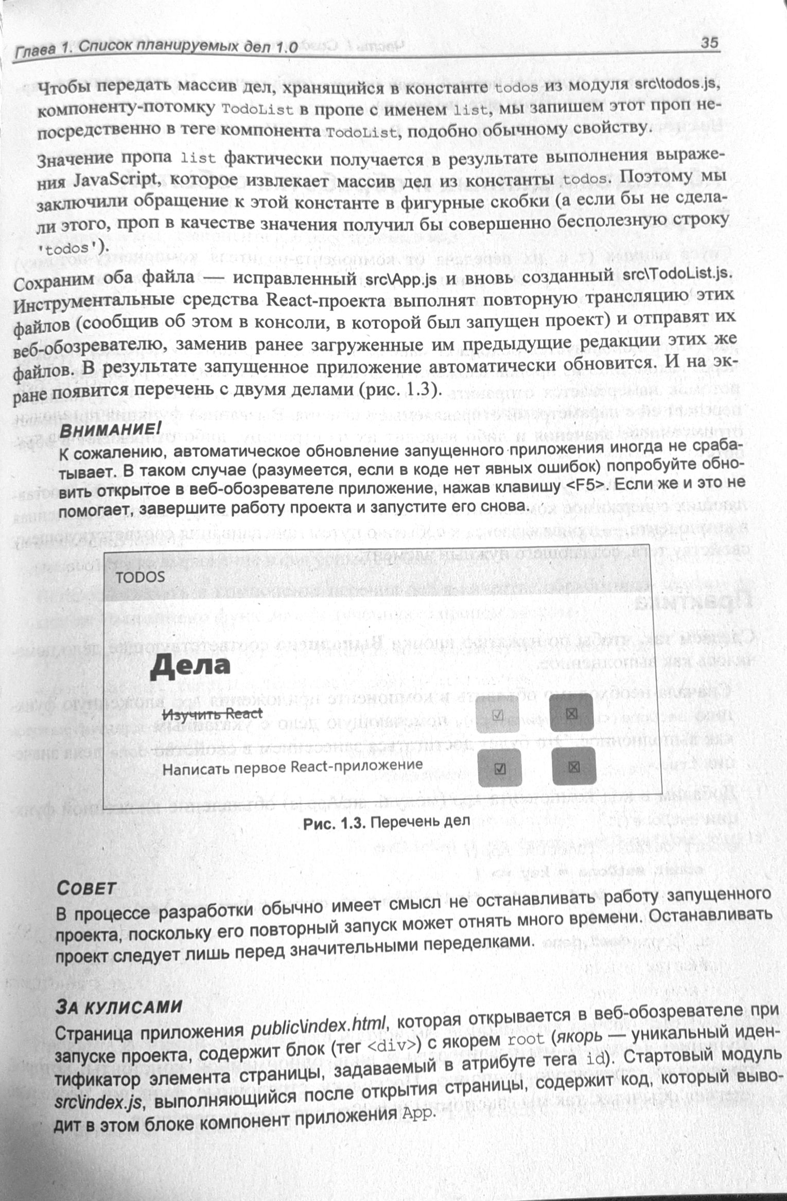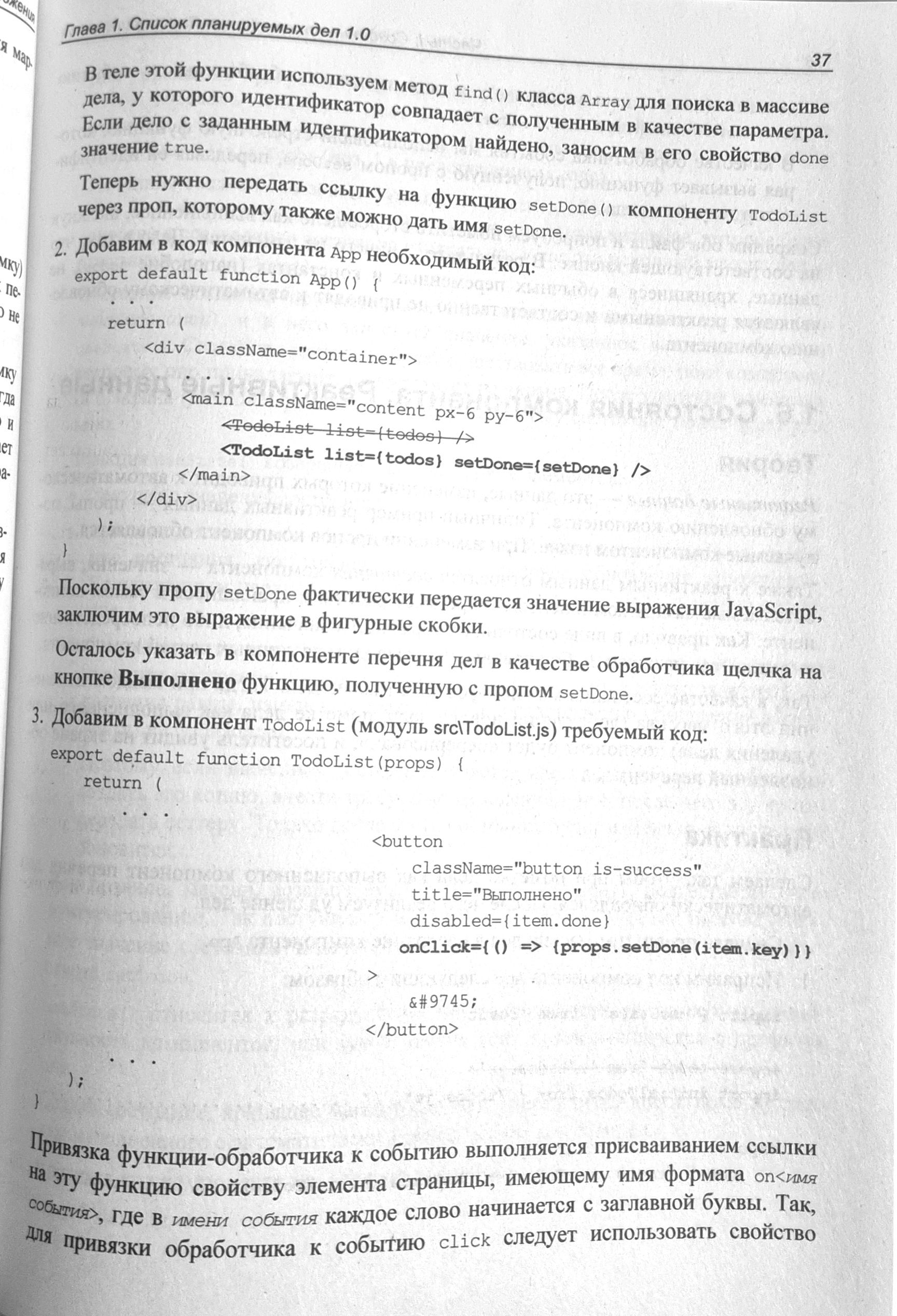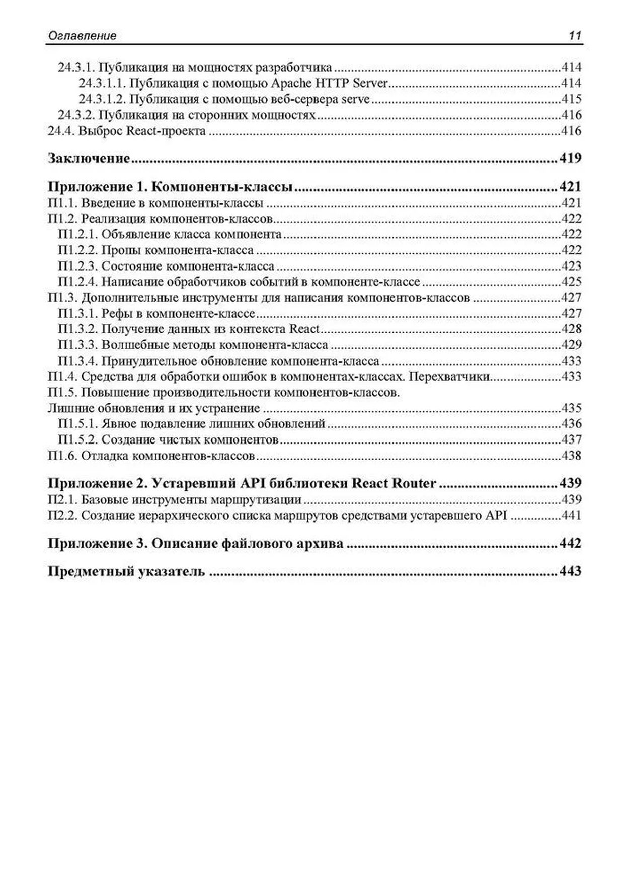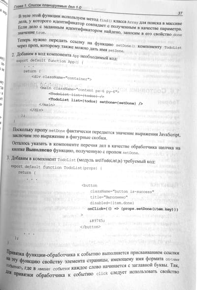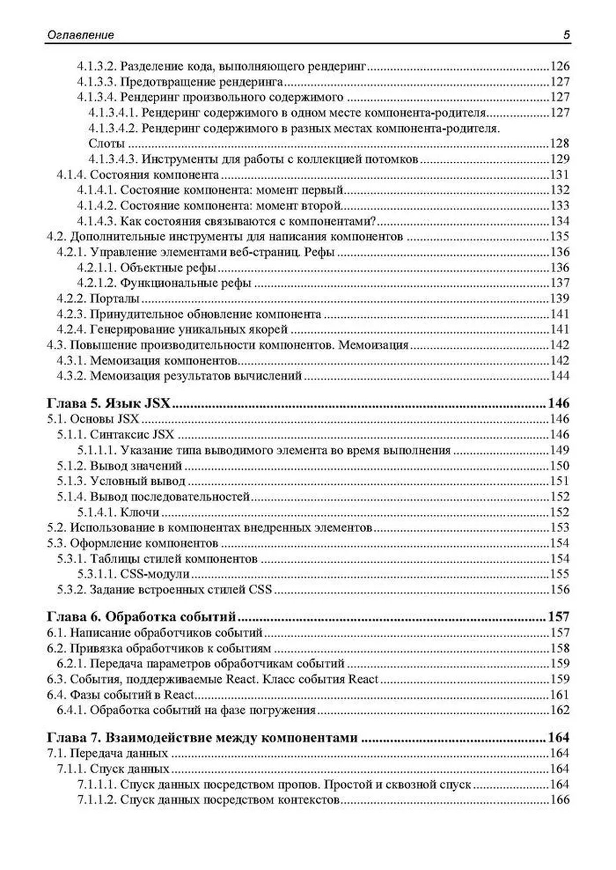 The book is devoted to programming web applications in JavaScript using the popular web framework React. It provides an introductory course that clearly describes step-by-step the development of a simple web application - a list of planned tasks. It describes basic tools: creating and configuring a React project, writing components, the JSX language, passing data between components and creating web forms. It covers useful additional libraries: React Router (navigation), Redux, React Redux and Redux Toolkit (centralized data storage), Formik (rapid development of web forms), Yup (validation), React Reveal (animation effects), etc. It talks about code splitting, error handling, debugging tools, publishing a finished web application and server-side rendering.