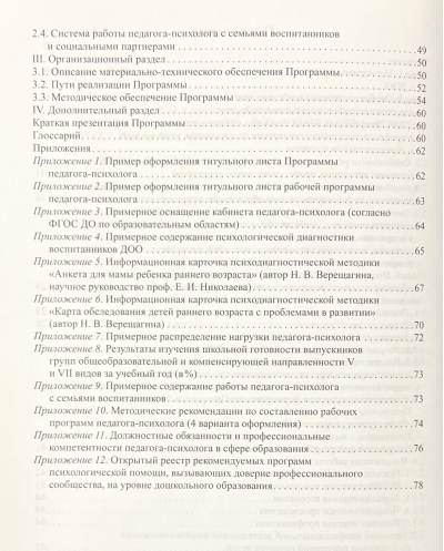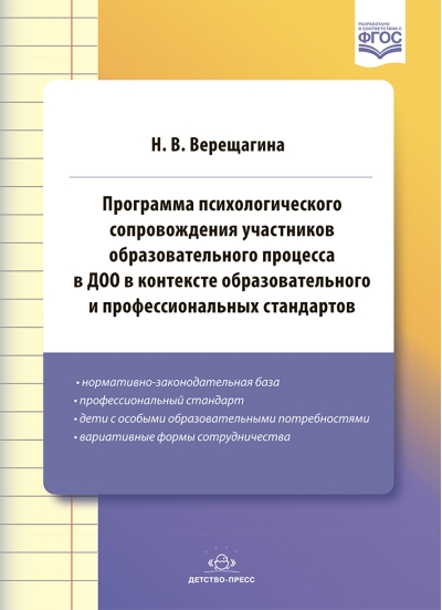 The manual is a comprehensive development of conditions for psychological support of participants of educational relations (children, parents, teachers, administration) in ECE center in the conditions of implementation of educational and professional standards. The program of psychological support is a mandatory document of a teacher-psychologist, as it ensures the implementation of the basic and/or adapted general education program of preschool education. According to the concept of the program of psychological support, the working programs of the teacher-psychologist, aimed at solving certain problems (ensuring emotional comfort in newly recruited groups, during the adaptation of children in kindergarten, the development of higher mental functions of children, etc.) are drawn up. The presented program of psychological support of the participants of the educational process in preschool educational organization is approved by the Department of Psychology of the Academy of Postgraduate Pedagogical Education (St. Petersburg). The manual contains references to current normative-legislative acts for organizing the work of a teacher-psychologist in a preschool educational organization, and lists psychological assistance programs from the open register of programs that are trusted by the professional community. This manual is practice-oriented, so it will be of interest to practicing and novice teacher-psychologists of preschool educational organizations, as well as students of psychology and pedagogy.