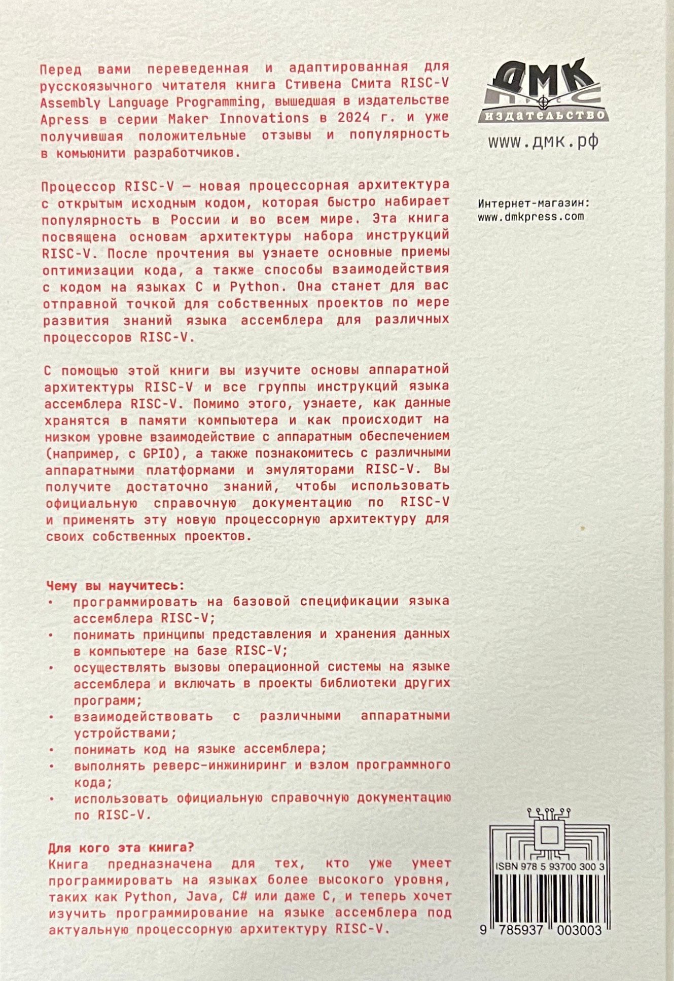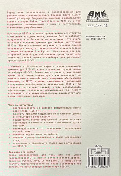 Before you is a translated and adapted for Russian-speaking readers book by S. Smith "RISC-V Assembly Language Programming", published in Apress publishing house in the Maker Innovations series in 2024 and has already received positive reviews and popularity in the community of developers.