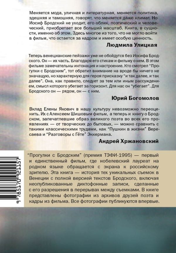 The documentary film "Walks with Brodsky" was filmed in 1993 in Venice by directors Alexei Shishov and Elena Yakovich and won the first-ever TEFI award. This film, the first and only one in which the Nobel laureate addressed Russian audiences in his native language, was watched on television across the country. The book "Walks with Brodsky and So On" is Elena Yakovich's captivating account of those few days in Venice when Joseph Brodsky and his friend, the poet Yevgeny Rein, strolled through the city of canals, chatting, along with the filmmakers. The author presents here the full version of Brodsky's texts from this unique filming, as well as audio recordings made with his permission. These are believed to be Brodsky's last unpublished texts. The book includes photographs from the archives of the poet's friends and stills from the film "Walks with Brodsky."