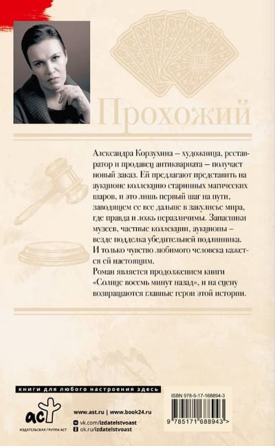 Alexandra Korzukhina, an artist, restorer and antique dealer, receives a new order. She is offered to present a collection of ancient magic balls at an auction, and this is only the first step on a path that takes her further and further behind the scenes of a world where truth and lies are indistinguishable. Museum storerooms, private collections, auctions - everywhere the fake is more convincing than the original. And only the feeling of a loved one seems real to her. The novel is a continuation of the book "The Sun Eight Minutes Ago", and the main characters of this story return to the stage.