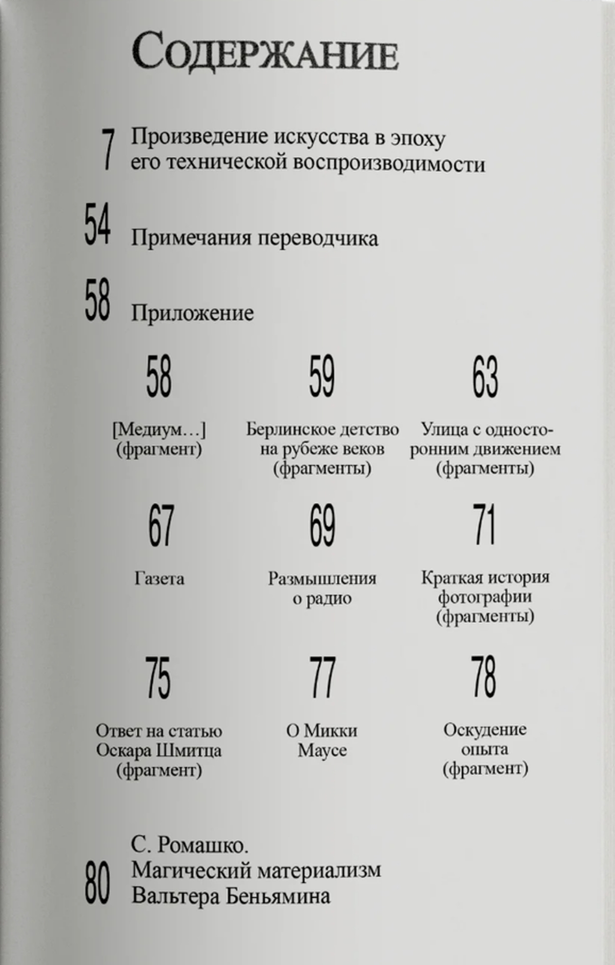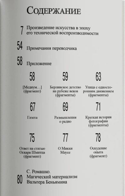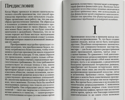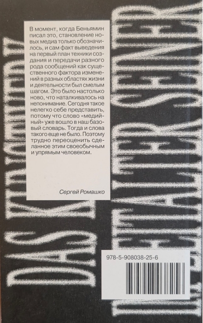 Walter Benjamin's most famous essay explores the transformation of artistic perception in the face of technological innovations in the creative process, analyzing how new media have altered the understanding of the uniqueness and authenticity of a work of art becoming an object of mass consumption. Sergei Romashko, author of the classic translation of "The Work of Art," wrote a detailed article especially for this edition, accompanied by a selection of Benjamin's texts illustrating the author's intellectual journey toward this work. Some of these texts are being published in Russian for the first time ("Medium...," "Newspaper," "Reflections on Radio," "Response to Oskar Schmitz's Article," and "About Mickey Mouse").