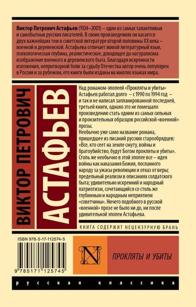 Over the novel epic "Cursed and Murdered" Astafiev worked for a long time - from 1990 to 1994 - and never wrote the planned last, the third book, but this did not prevent the work to become one of the most powerful and poignant examples of Russian "military" prose. The very title of the novel, which came from the writings of the Russian Old Believers, is unusual: "All those who sow confusion, war and fratricide on earth will be cursed and killed by God. Equally unusual in this epic is everything - the idea of war as God's punishment, sent to the people for the horrors of the revolution and the abandonment of faith; extreme realism in the descriptions of the soldiers' everyday life; surprisingly sincere and popular patriotism, combined with an equally deep and popular rejection of the "Soviet". There was nothing like it in Russian "military" prose neither before nor after Astafiev's amazing epic.