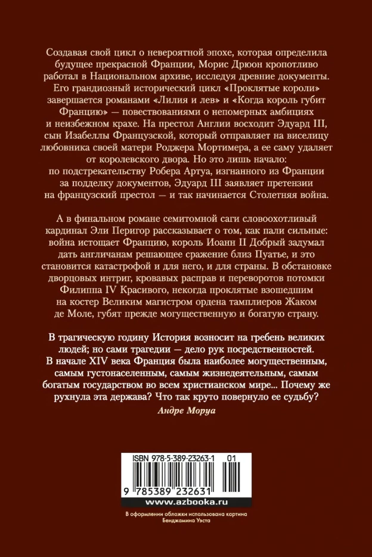 Creating his cycle about the incredible era that shaped the future of beautiful France, Maurice Druon painstakingly worked in the National Archives, researching ancient documents. His grand historical cycle "Cursed Kings" concludes with the novels "The Lily and the Lion" and "When the King ruins France" - a tale of exorbitant ambition and inevitable collapse. On the throne of England rises Edward III, son of Isabella of France, who sends his mother's lover Roger Mortimer to the gallows, and her herself removed from the royal court. But this is only the beginning: at the instigation of Robert Artois, banished from France for forging documents, Edward III claims the French throne - and so begins the Hundred Years' War. And in the final novel of the seven-volume saga wordy Cardinal Elie Perigord tells how the strong have fallen: the war exhausts France, King John II the Good conceived to give the English a decisive battle near Poitiers, and it becomes a disaster for him and for the country. Amid palace intrigues, bloody massacres and coups, the descendants of Philip IV the Beautiful, once cursed by the Grand Master of the Templar Order Jacques de Molay, who had been put to the stake, destroy a formerly powerful and rich country.