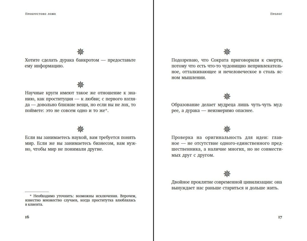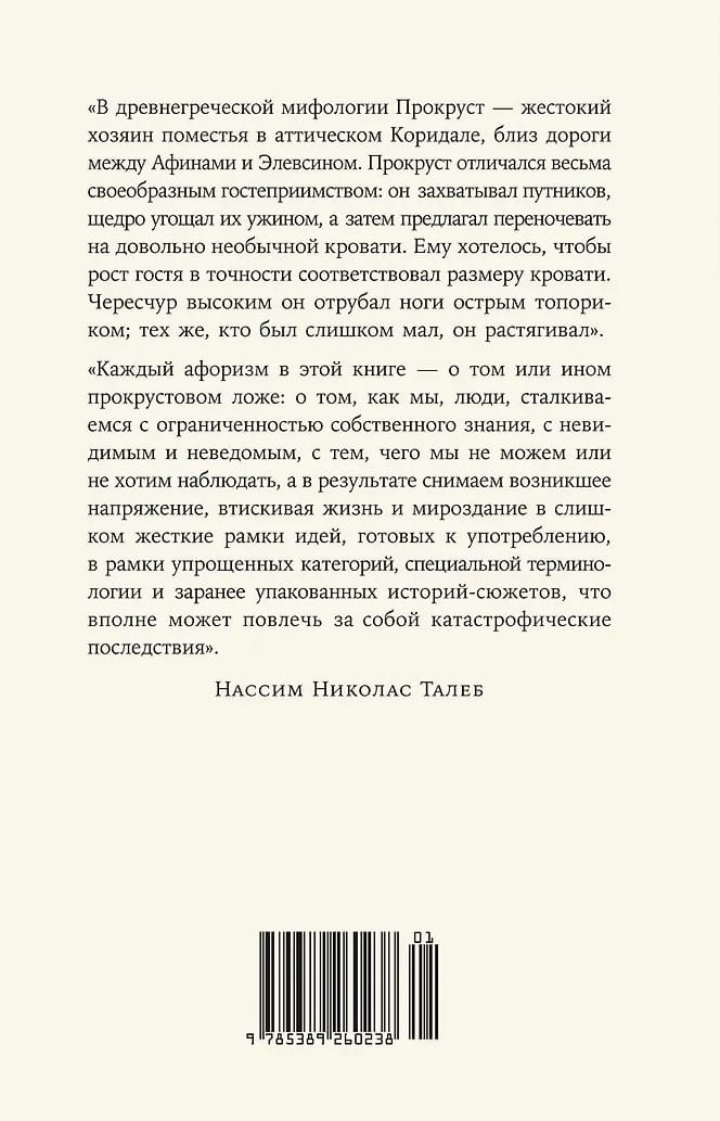 It's no coincidence that Nassim Taleb's collection of aphorisms received its title. As the author himself explains: "Each aphorism in this book is about a particular Procrustean bed: how we humans confront the limitations of our own knowledge, the invisible and the unknown, what we cannot or do not want to observe, and as a result, we relieve the resulting tension by squeezing life and the universe into the overly rigid framework of ready-made ideas, simplified categories, specialized terminology, and prepackaged stories, which can easily lead to catastrophic consequences."