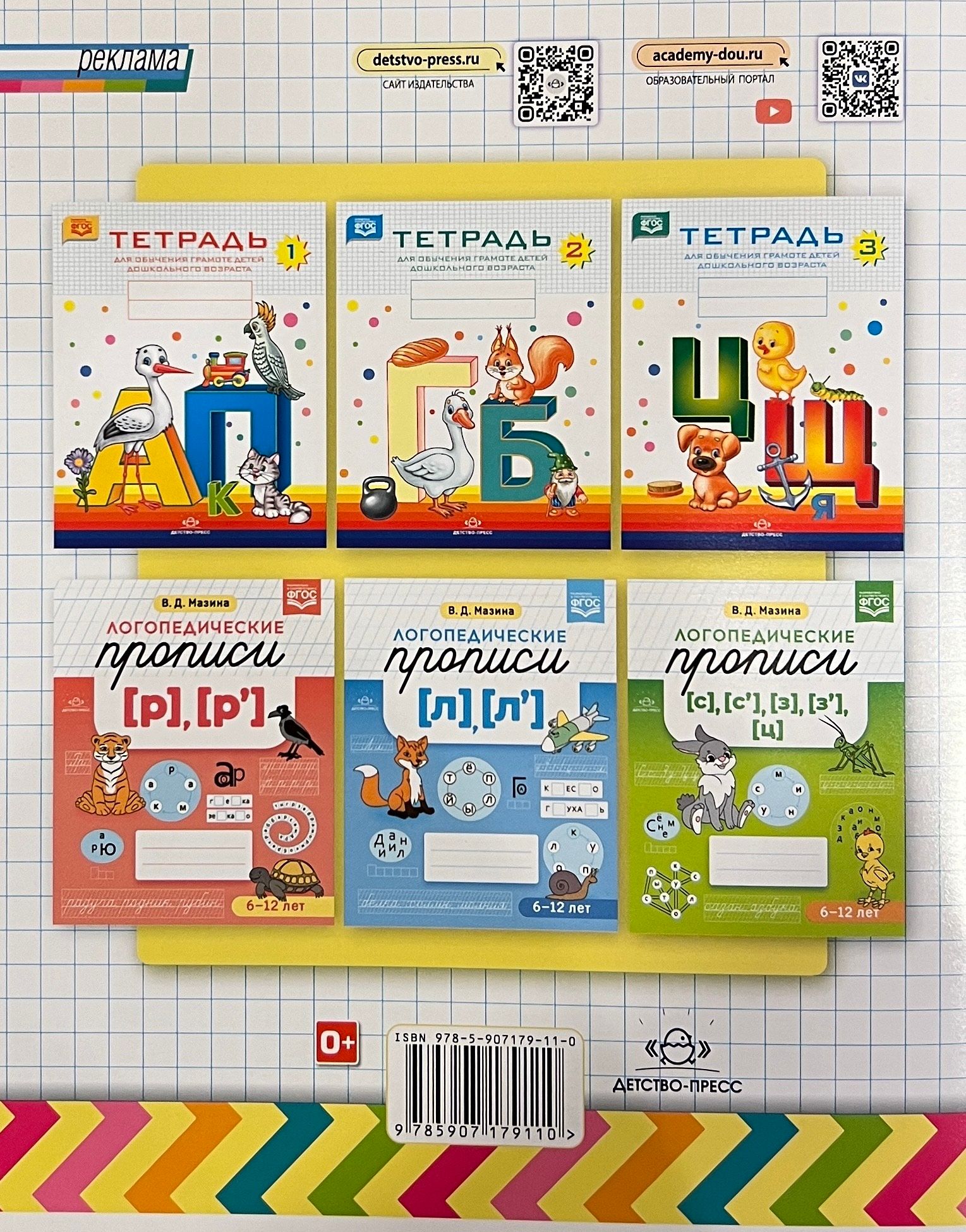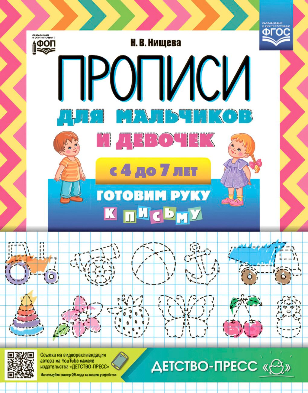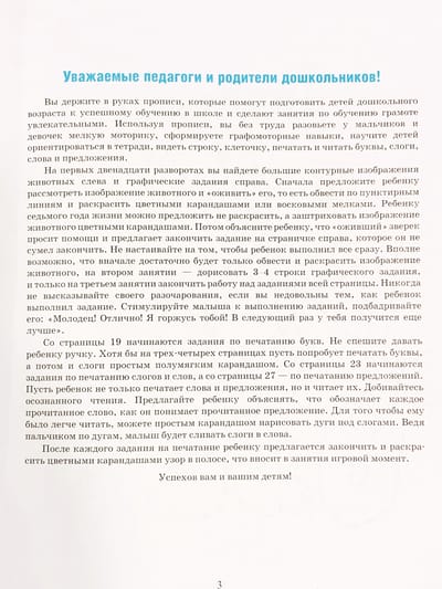 The copybooks are designed for preschool children from 4 to 7 years old and can be used when teaching preschoolers literacy. The tasks of the copybooks will help develop children's fine motor and graphomotor skills, form their orientation skills in the notebook, teach them to see the line and cell, print, i.e. write with printed letters, syllables, words and sentences, and then read them. The tasks will be interesting for both boys and girls, as the notebook presents patterns consisting of both flowers and butterflies, and ships and cars. And images of cheerful animals will make the lessons exciting. Recommended for teachers and parents for lessons with preschool children from 4 to 7 years old.