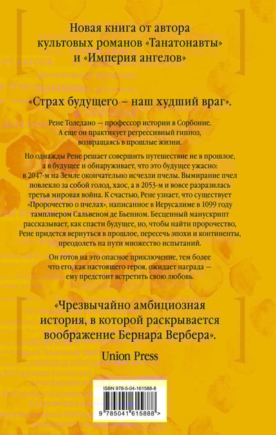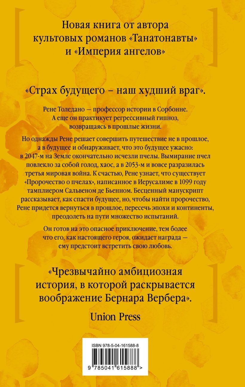 René Toledano is a history professor at the Sorbonne. He also practices regressive hypnosis, which allows one to return to past lives. But one day, René decides to travel not to the past, but to the future, and discovers with horror that this future is terrible: in 2047, bees finally disappeared from the earth, and the extinction of one biological species led to famine, chaos, and eventually the Third World War. Fortunately, René learns that there is a "Prophecy of the Bees", written in Jerusalem in 1099 by the Templar Salvin de Bienne. This text tells how to save the future. However, to find this priceless manuscript, René will have to go back in time, cross eras and continents, and overcome many trials along the way. He is ready for this dangerous adventure, because the fate of humanity is at stake.