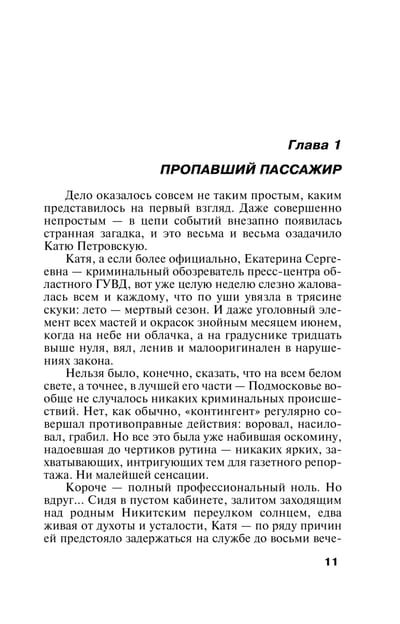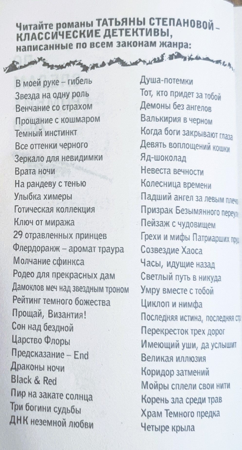 The novels of hereditary investigator Tatyana Stepanova allow the reader to visit a literary "fear room". Mysterious murders, an almost tangible atmosphere of crime, a languid and anxious expectation of something unknown, frightening... Tatyana Stepanova manages to reproduce all this simply brilliantly. Chance encounters, everyday affairs, and insignificant details are depicted in her detective stories in a special, dramatic light, like a harmless spring meadow before a rapidly approaching thunderstorm.