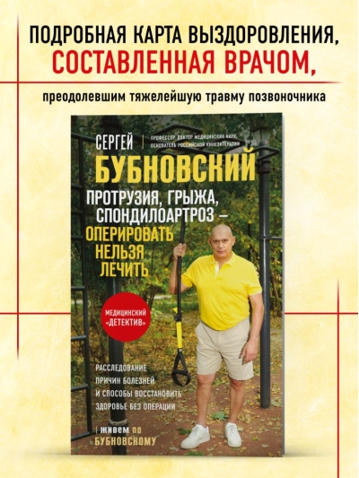 Sergey Bubnovsky is a Doctor of Medical Sciences, professor, and the author of non-surgical methods for treating the spine and joints. He is also the creator of a new field of medicine—kinesitherapy—in which patients actively participate in their own recovery through their own internal resources and understanding of their body.