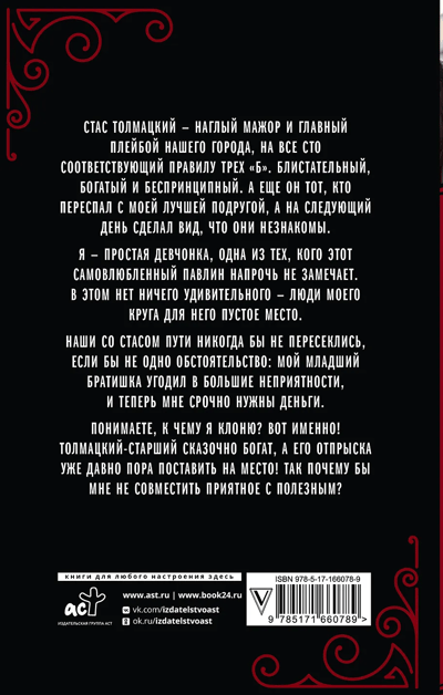 I'm a simple girl, one of those this narcissistic peacock completely ignores. This isn't surprising—people of my social circle are nothing to him. Stas and I would never have crossed paths if not for one thing: my little brother is in big trouble, and now I urgently need money.