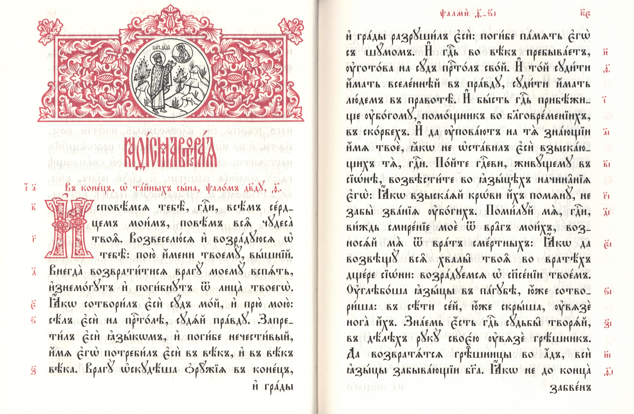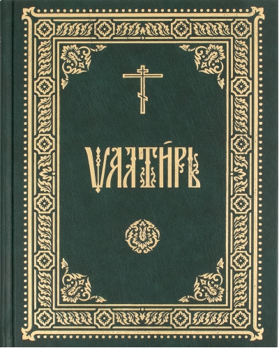 This medium-sized Psalter, printed in two colors in large Church Slavonic font on tinted offset paper, is presented in a hardcover with gold foil stamping. The text is richly decorated with tracings, initials, and ornaments.