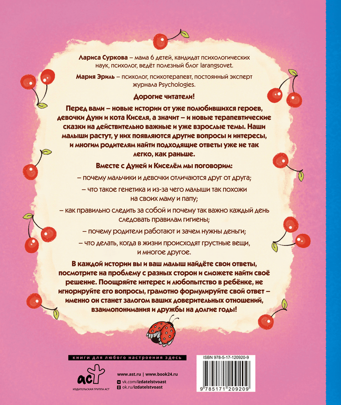 Together with Dunya and Kisel we will talk about: - why boys and girls are different from each other; - what genetics is and why babies look so much like their mom and dad; - how to take care of yourself and why it is so important to follow the rules of hygiene every day; - why parents work and why you need money; - what to do when sad things happen in life, and much more. In each story, you and your child will find your own answers, look at the problem from different angles and find your own solution. Encourage your child's interest and curiosity, do not ignore his questions, formulate your answer correctly - it will be the key to your trusting relationship, mutual understanding and friendship for many years!