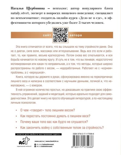 This book is different from anything you've heard on the subject of slimness before. It's not about diets, willpower, massages or acupuncture. After all, if all this works, then, as a rule, very short-term. Then the weight rolls back again, and the whole struggle begins in a new circle. And the point is not that you are lazy, insufficiently motivated or something wrong, but that the methods that are widely used to work with weight - underdeveloped. They work not with the "root" of the problem, but with the "top".