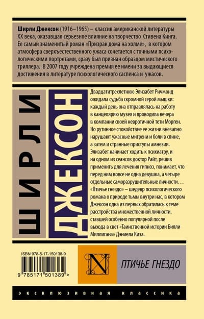 "The Bird's Nest" - a masterpiece of a psychological novel about the nature of darkness within us, in which Jackson was one of the first to address the theme of multiple personality disorder, which became especially popular after the publication of "The Mysterious Story of Billy Milligan" by Daniel Keyes.