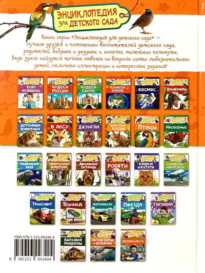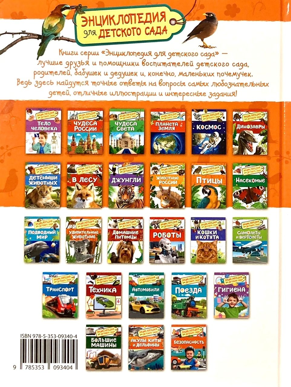 The book from the series "Encyclopedia for kindergarten" will introduce the child to the world of birds. He will learn what habitats birds have, whether all birds can fly, why they have beaks and paws, where and how they build nests, how they hatch chicks.