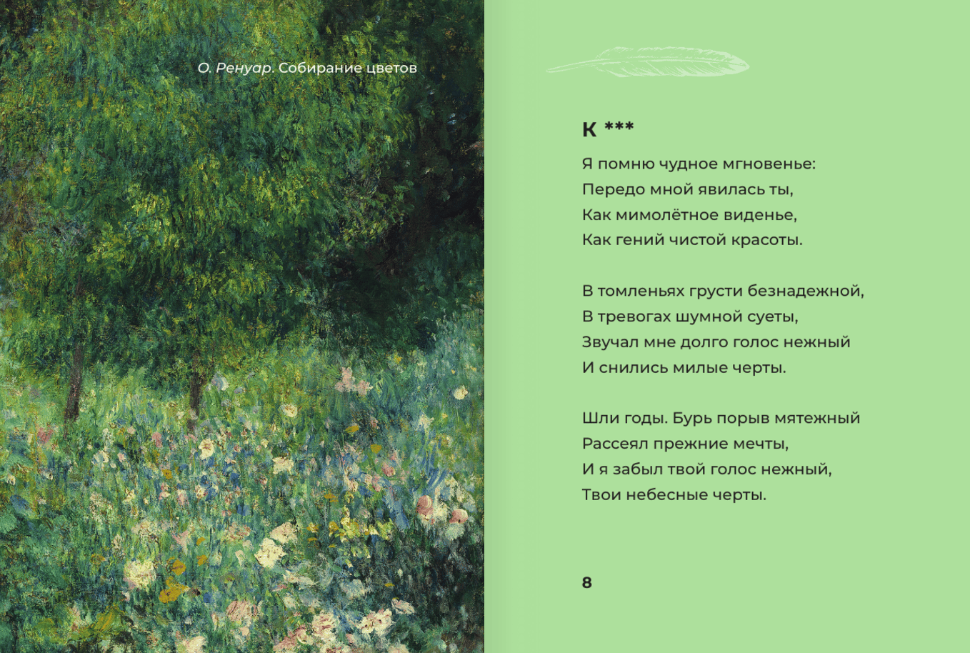 Alexander Pushkin is loved, read and quoted all over the world. Pushkin’s poetry is an absolute harmony in which opposite principles are united, striking in their sincerity and beauty. In this book, the reader will find dedications to friends, declarations of love to dear ladies, nostalgia for their native places, reflections on the vocation of the poet and the role of poetry, supplemented by vivid illustrations selected specifically for each poetic masterpiece.