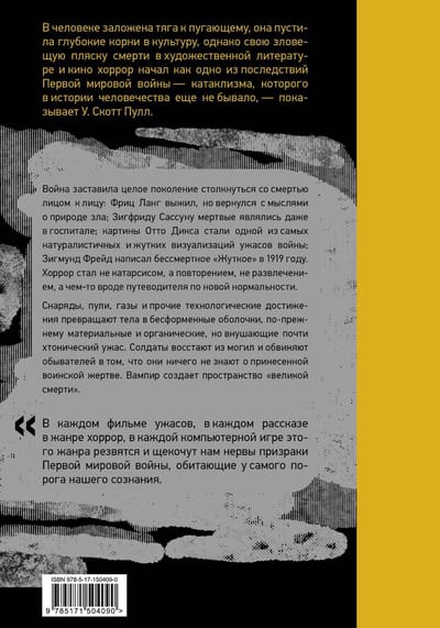 The human craving for the frightening is inherent in man and has taken deep roots in culture, but its ominous dance of death in fiction and film began as one of the consequences of the First World War, a cataclysmic event that had never happened before in the history of mankind," shows W. Scott Pull.