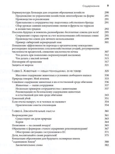 In this book Sepp Holzer, an agrarian revolutionary, author of his own method of farming - Holzer permaculture, summarizes his experience of land regeneration and creation of efficient farming in different countries of the world. The main idea of the author is that nature is wise and rich, you cannot impose on it solutions that contradict its laws, you must learn to understand them and act in harmony with them. Only in cooperation with Nature it will be possible to recreate the paradise we have destroyed. The book is addressed to everyone who is connected with the earth and is not indifferent to the future of our planet. It will help to realize the necessity to think in accordance with Nature, will show how wide are the possibilities of man in healing the Earth, and will prompt how to understand the causes of the current situation, to realize the consequences of their own actions in the future and to live in full harmony with Nature.