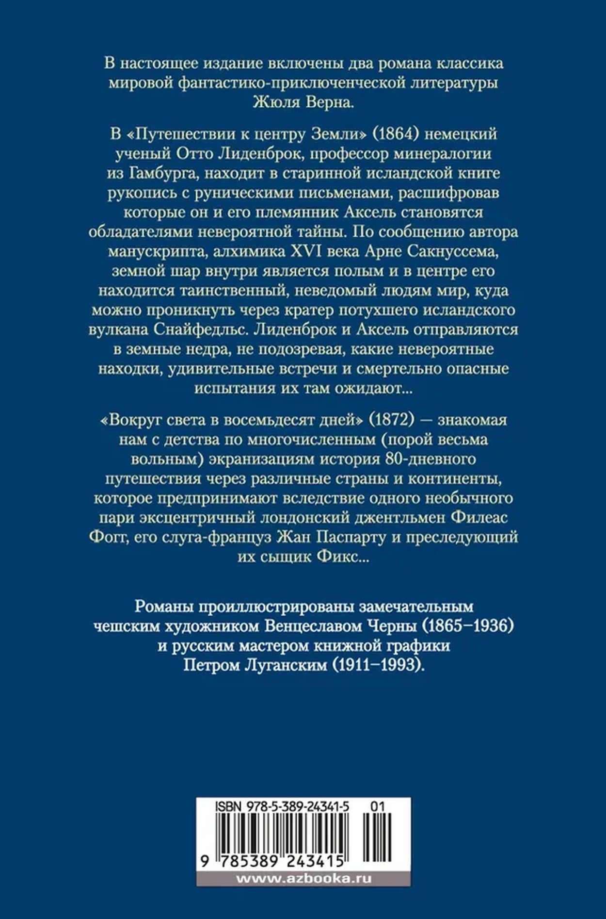 This edition includes two novels by the classic of world fantasy and adventure literature Jules Verne. In "Journey to the Center of the Earth" (1864), the German scientist Otto Lidenbrock, a professor of mineralogy from Hamburg, finds a manuscript with runic writings in an ancient Icelandic book, having deciphered which he and his nephew Axel become the owners of an incredible secret. According to the author of the manuscript, the 16th-century alchemist Arne Saknussemm, the globe is hollow inside and in its center there is a mysterious world unknown to people, which can be penetrated through the crater of the extinct Icelandic volcano Snæfells. Lidenbrock and Axel set off into the depths of the earth, unaware of the incredible discoveries, amazing encounters and deadly trials that await them there... Around the World in Eighty Days (1872) is a story familiar to us from childhood from numerous (sometimes very free) film adaptations of an 80-day journey through various countries and continents, undertaken as a result of an unusual bet by the eccentric London gentleman Phileas Fogg, his French servant Jean Passepartout and the detective Fix pursuing them... In this edition, the novels are illustrated by the remarkable Czech artist Ventseslav Cerny (1865-1936) and the Russian master of book graphics Petr Lugansky (1911-1993).