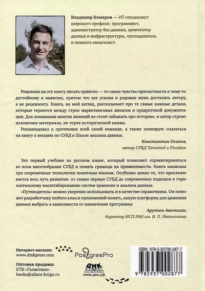 The book describes the architectural principles on which all modern database management systems are based, as well as the algorithms and data structures used in them. Special attention is paid to the comparison of implementations of the same approaches in platforms that are close in functionality. In addition, an original classification of DBMSs is proposed and the issues of operation and security are considered.