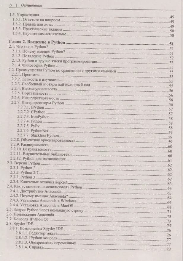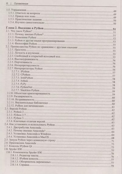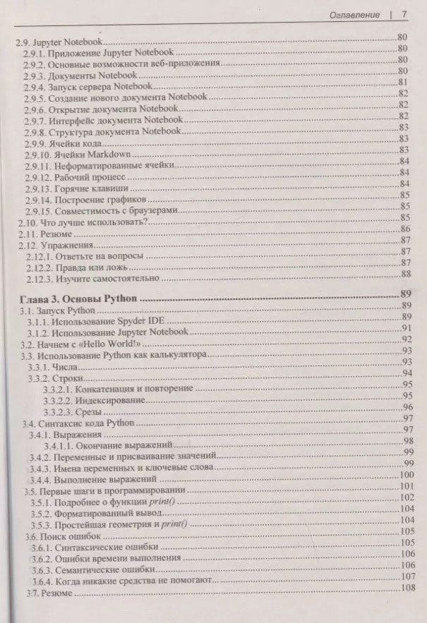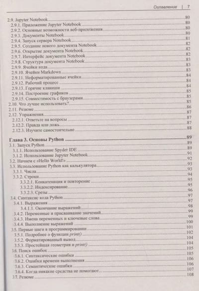 The basics of Python syntax are considered on the example of Anaconda distribution. IPython, Spyder IDE, Jupyter Notebook applications are shown. The syntax of variables, functions, loops is described. Data structures in Python are studied in detail: strings, lists, tuples, sets, and dictionaries. The concept of classes and their application in object-oriented programming is explained. The capabilities of the Pillow image processing library and the Tkinter library for creating GUI applications are described. A separate section is devoted to error and exception handling in programs. NumPy and Pandas libraries are considered, practical examples of their use for data analysis and processing are given. Matplotlib library and its capabilities in data visualization are described.