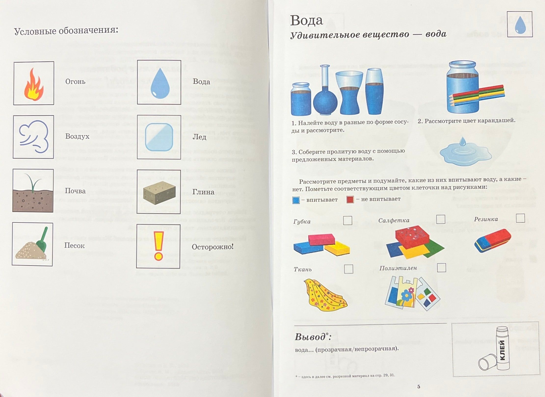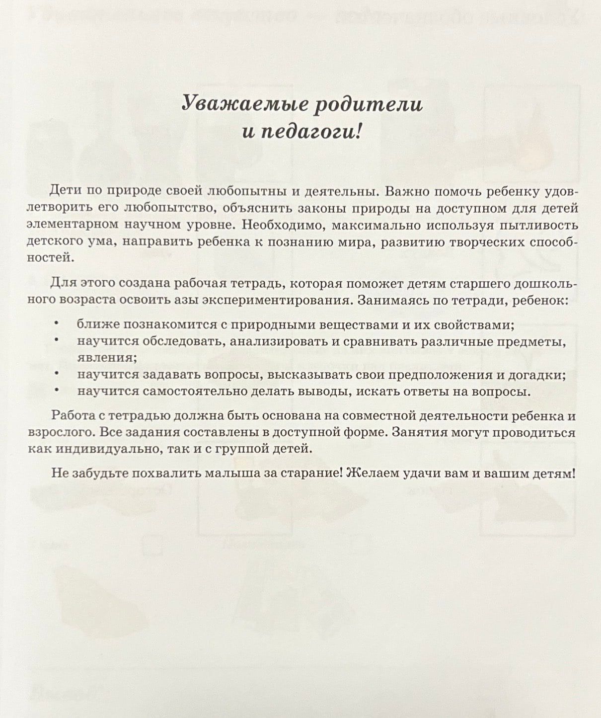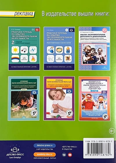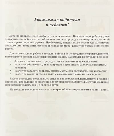 The notebooks will help children aged 5-6 to learn the basics of experimentation. Using the notebooks, the child will get acquainted with natural substances and their properties, learn to examine, analyze and compare various objects and phenomena, learn to ask questions, express their assumptions and guesses, learn to draw conclusions independently, and look for answers to questions. Work with the notebooks should be based on joint activities of the child and an adult. The publication is recommended for teachers of preschool educational institutions and parents of preschool children.