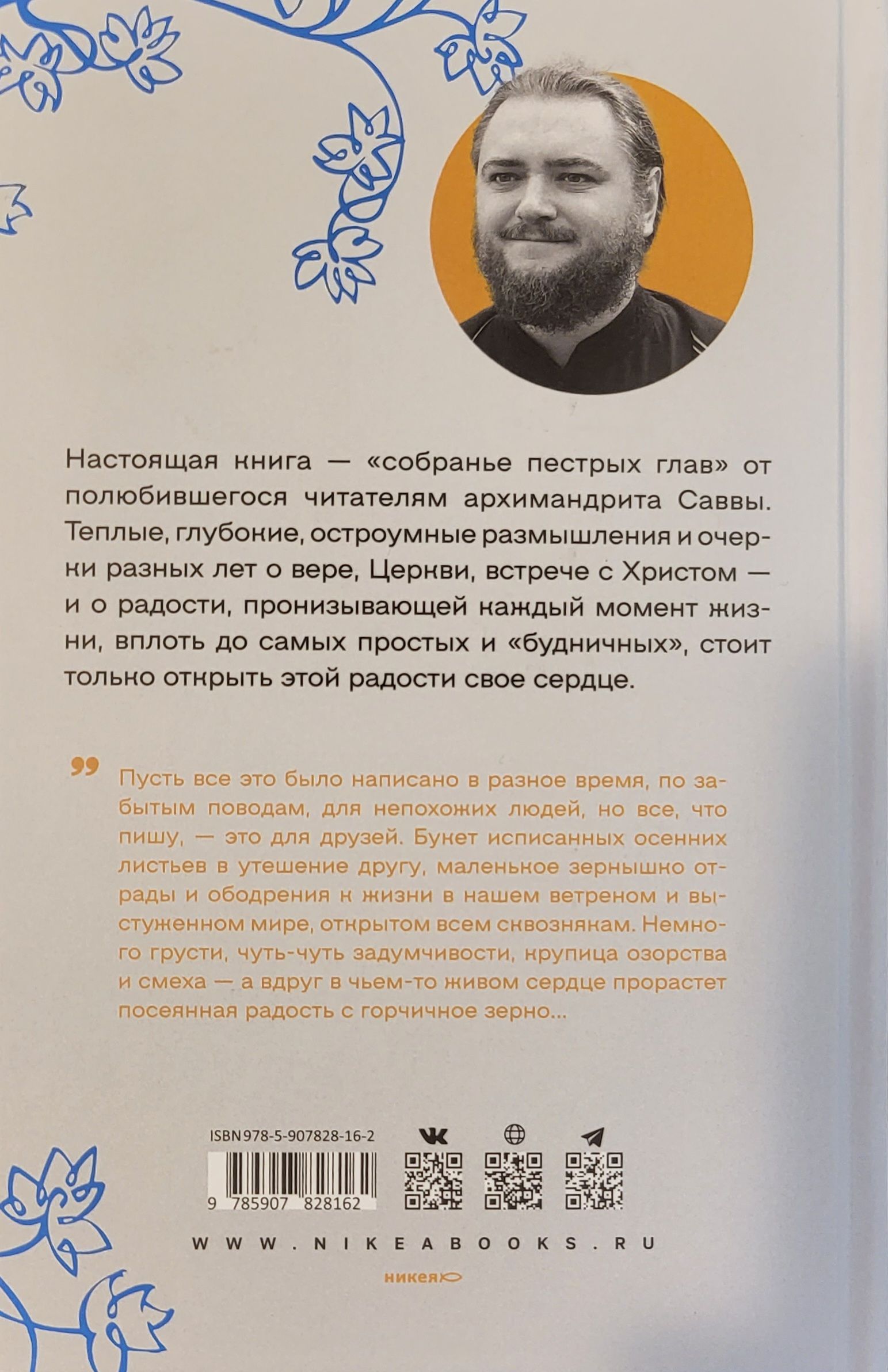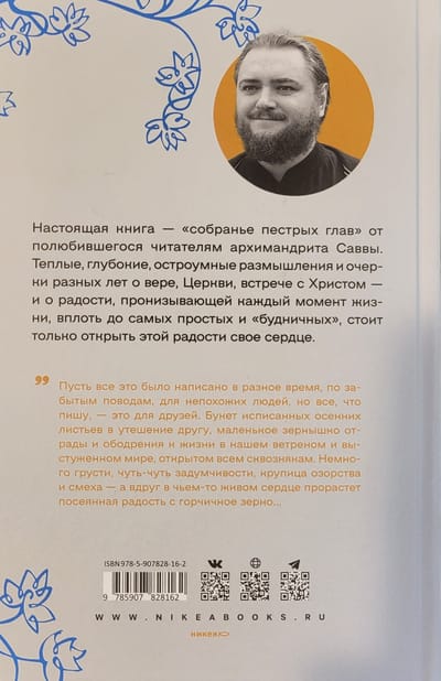 This book is a "collection of variegated chapters" by the beloved Archimandrite Savva. Warm, deep, witty reflections and essays from different years about faith, the Church, encounter with Christ - and about the joy that pervades every moment of life, down to the simplest and most "mundane", if you only open your heart to this joy.