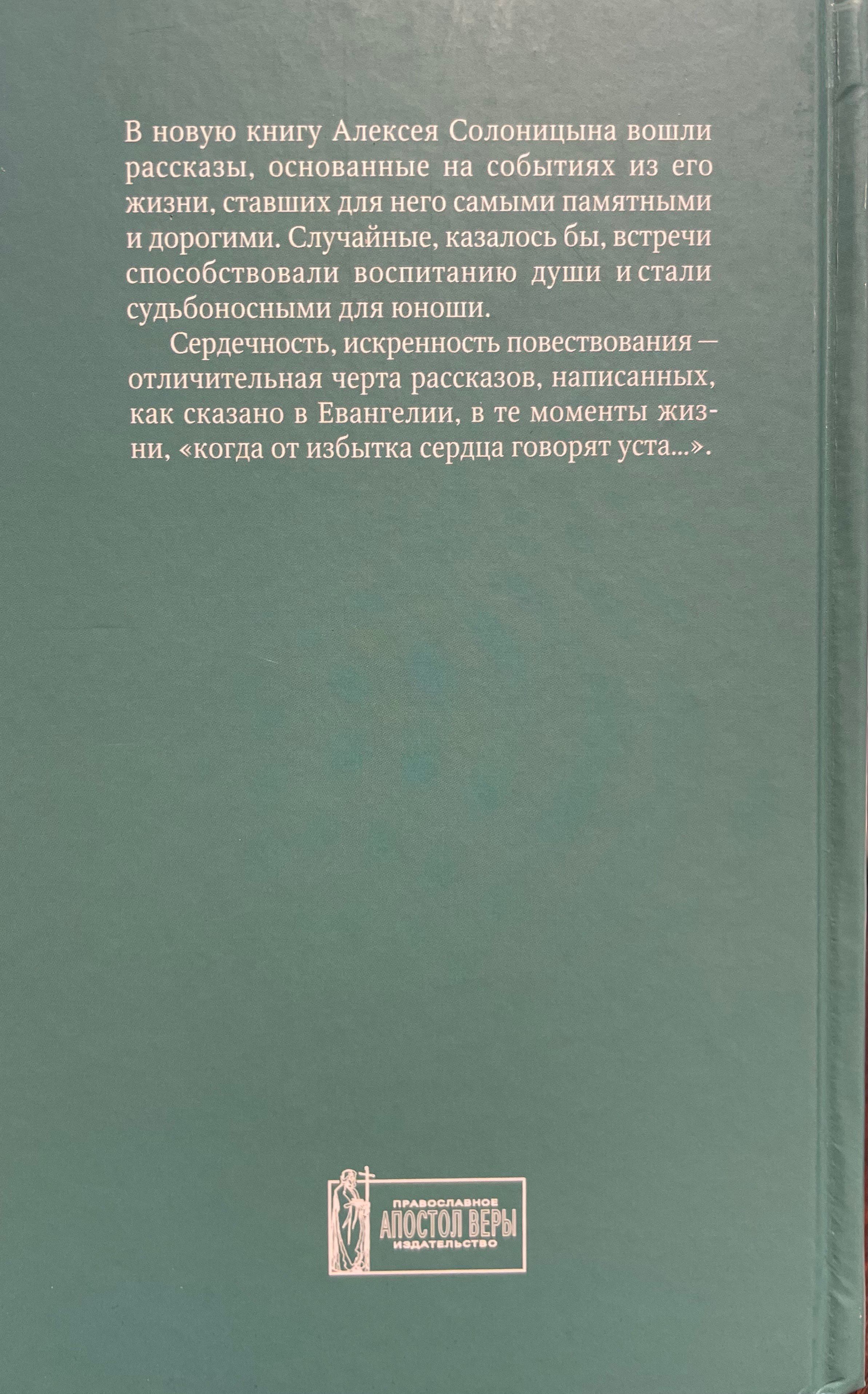 Alexey Solonitsyn's new book includes stories based on the events of his life that became the most memorable and precious to him. Seemingly chance encounters contributed to the formation of his soul and became life-changing for the young man. Warmth and sincerity in the narrative are the hallmarks of these stories, written, as the Gospel says, in those moments of life "when out of the abundance of the heart the mouth speaks."