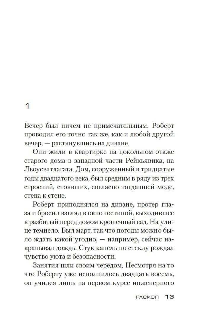 Settling on an abandoned farm, cut off from the world by the harsh nature, was a risky idea. On one side was the icy northern sea, on the other were mountains that could only be traversed through a snow-covered pass, and darkness.... On an old photograph that fell into the hands of Ari Thor, a policeman from a small Icelandic town, all the participants of the tragedy that played out here many years ago, among them a young woman poisoned with rat poison.... Ari Tor takes on the task of shedding light on this old story, but will it be the beginning of a new life drama...? The mysteries of the past connect with the mysteries of the present, and the investigation, which leads Ari Tor, intertwines with the case of child abduction and the investigation of strange murders in Reykjavik. "The Schism" - the third novel in the series about Ari Thor, which became a world bestseller, as well as other works by Ragnar Jonasson, "the king of Scandinavian noir", awarded prestigious literary awards and recognized as one of the best contemporary writers working in the genre of detective.