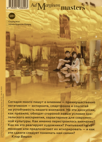 Claire Bishop (b. 1971) is a British art historian, curator, and professor of art history at the City University of New York. Her research interests include performance, installation, and “radical museology” as the main media of contemporary art. Continuing her reflections in these areas, she turns to the experience of the viewer, whose attention is today simultaneously fought for by complex art, an incessant flow of information, and the multitasking of modern life. The perception of performances that do not require a fixed point of view, take place at different sites, last for days or, conversely, only a couple of minutes, installations with an immense amount of archival material, etc., is mixed with messages in instant messengers, notifications, photography and video shooting for social networks, online and offline discussions of what is happening. Instead of dissatisfaction with the “inability to concentrate,” Bishop suggests accepting these conditions as a fact and rethinking a new form of scattered viewer attention.