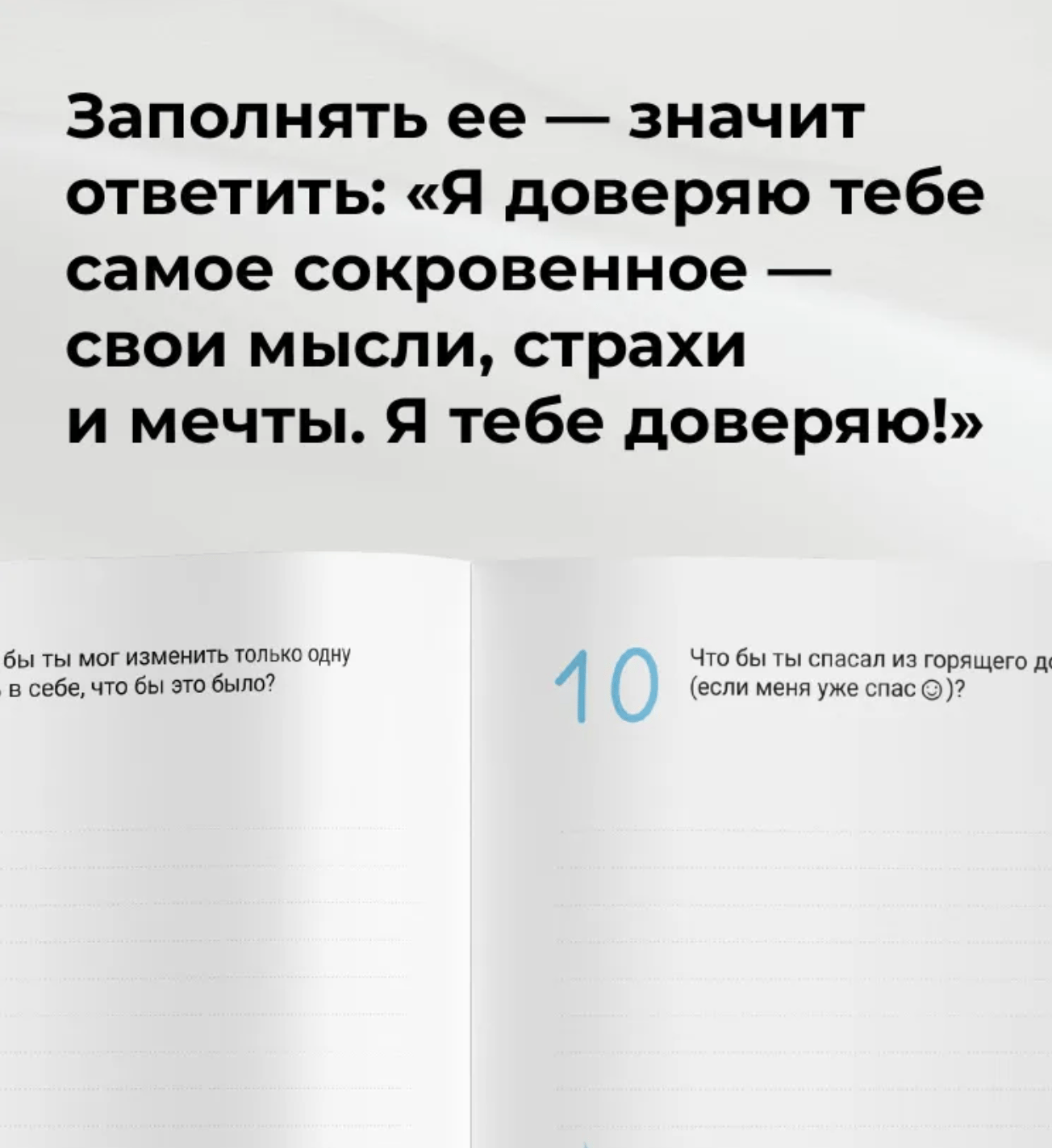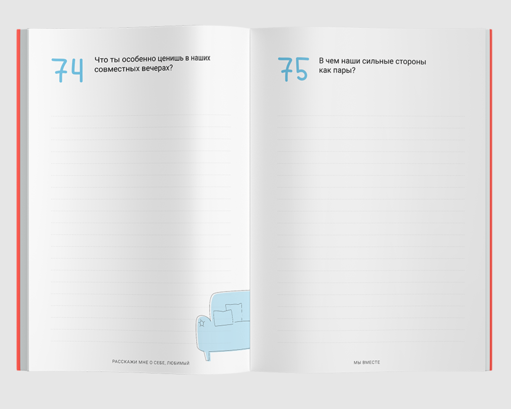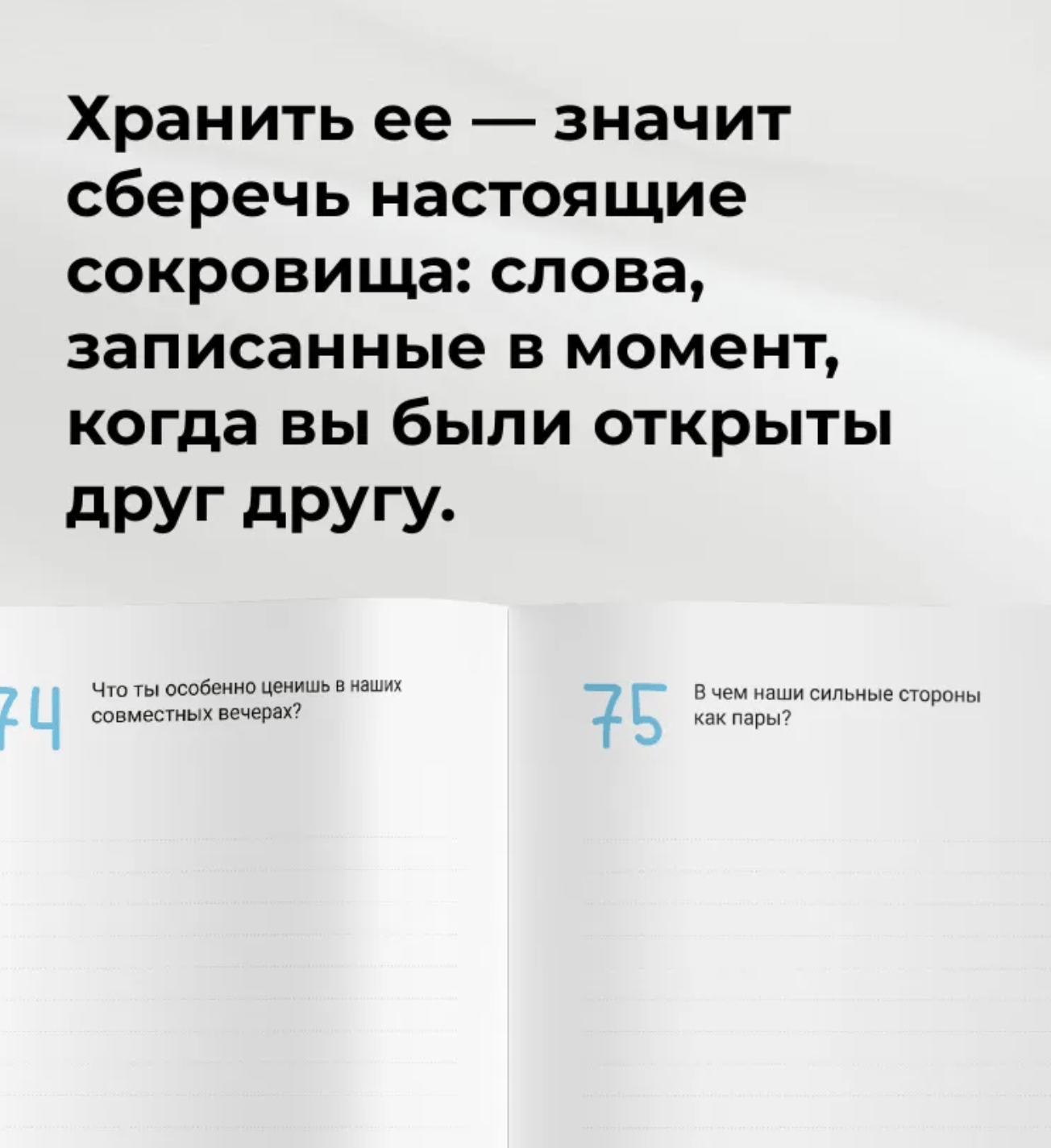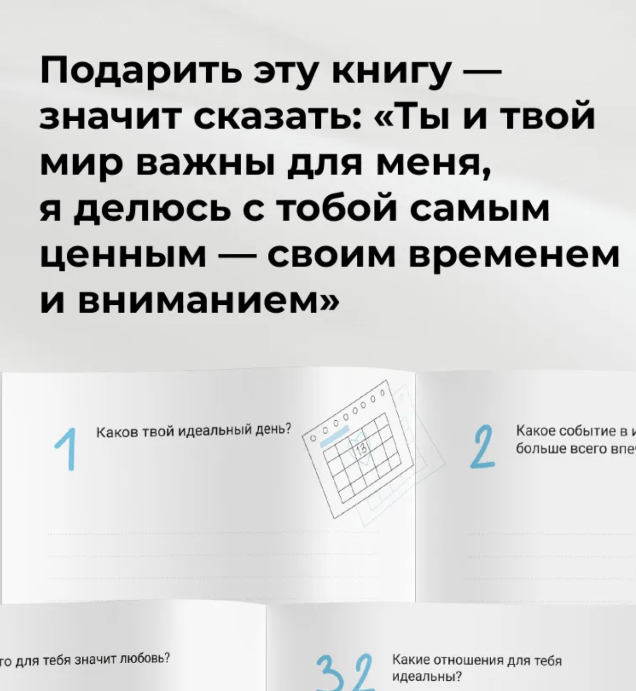 This is not just a questionnaire, but a carefully crafted space for dialogue. Each answer is a touchstone in the portrait of your loved one. Each answer is a bridge to even greater emotional intimacy. The book not only helps preserve memories but also discover new facets of a person you seemingly know well. Answers, drawings and photos will turn this diary into a unique artifact, a “time capsule”.