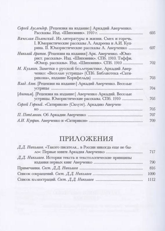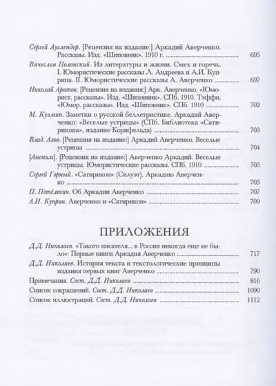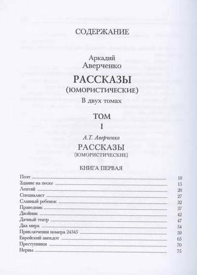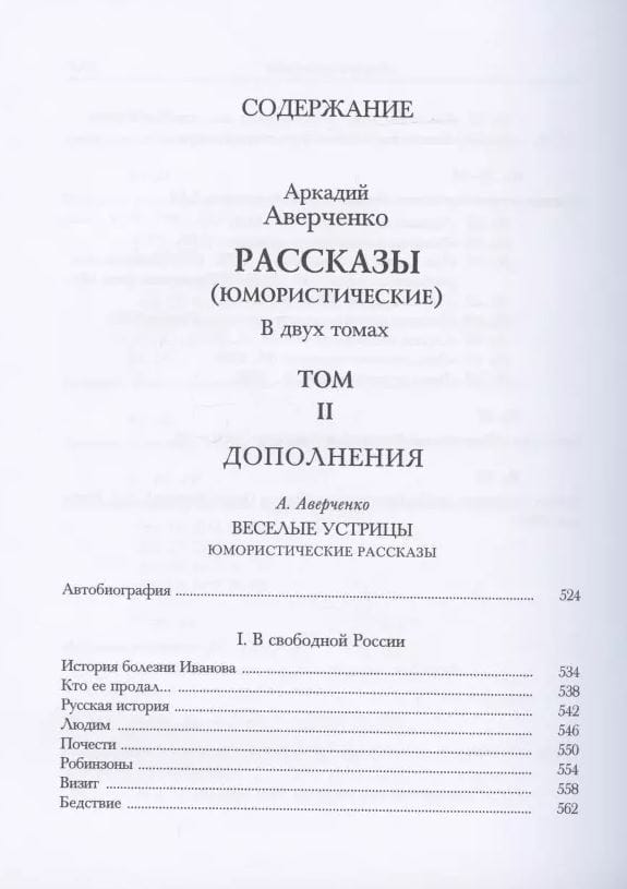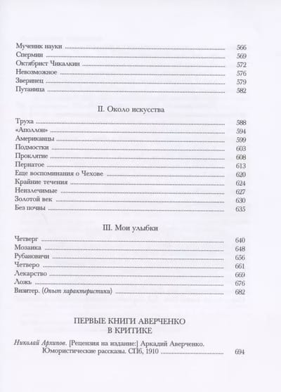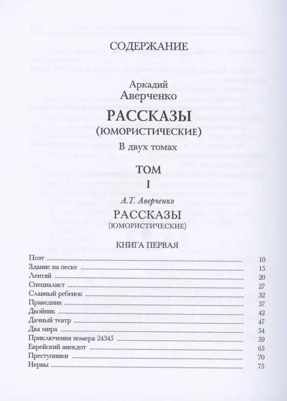 The first book of the two-volume set includes three collections of "Stories (humorous)", the second - a collection of "Merry Oysters", as well as memoirs and responses of famous contemporaries and critics of the writer. Of particular interest is the scientific apparatus of the edition, prepared by D.D. Nikolaev - a leading expert on the works of Averchenko.