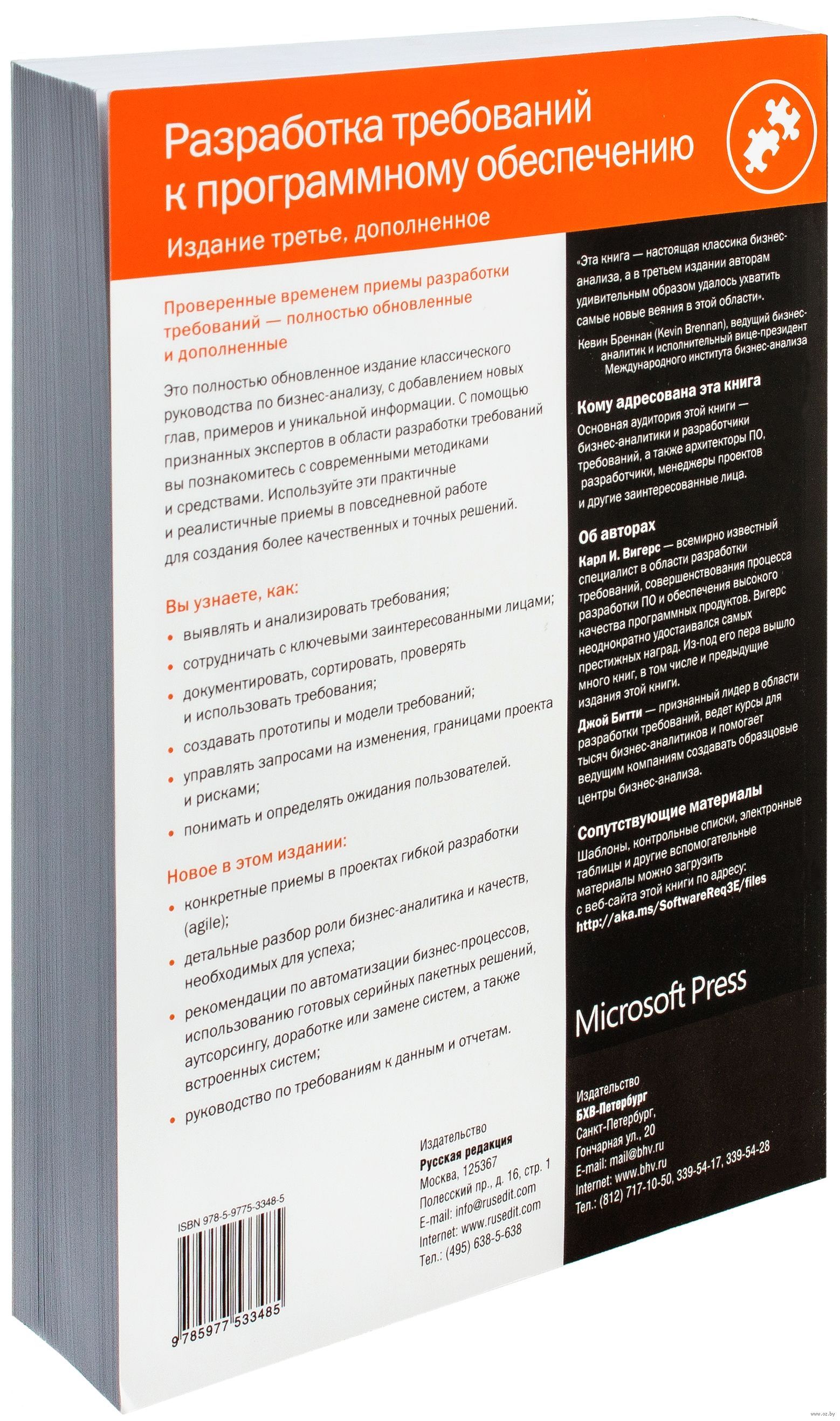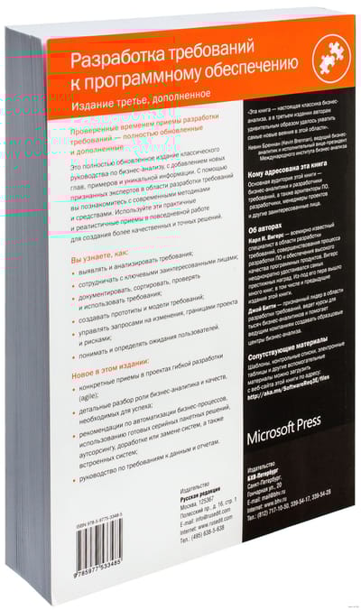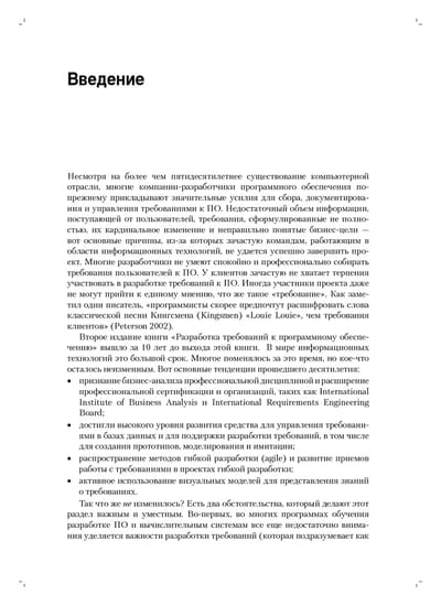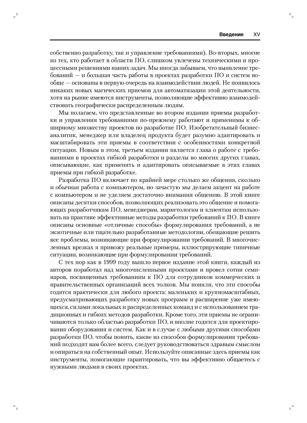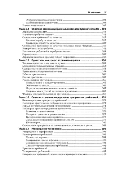 This book is a detailed guide to developing quality software requirements. It describes dozens of proven techniques for identifying, formulating, developing, validating, verifying, validating, and testing requirements to help developers, managers, and marketers create effective software. This edition is updated with new techniques for requirements development in agile development projects. The primary audience is business analysts and developers, as well as designers, programmers, testers, and other team members whose job it is to understand and satisfy customer expectations, and marketers, product managers, and project managers who must get into the "spirit" and features of a product to make it fully competitive. The book consists of 32 chapters, 3 appendices and a glossary of terms.