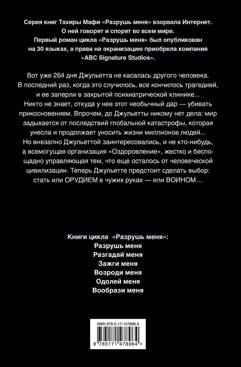 For 264 days Juliette has not touched another human being. The last time it happened, it ended in tragedy, and she was locked up in a closed psychiatric clinic...No one knows where she got this unusual gift - to kill by touch. However, no one cares about Juliet: the world is suffocating from the consequences of a global catastrophe, which has taken and continues to take the lives of millions of people ... But suddenly Juliet is interested in Juliet, and not just anyone, but the all-powerful organization "Recovery", rigidly and ruthlessly managing what is still left of human civilization. Now Juliette has to make a choice: to become either a tool in the hands of others - or a warrior....