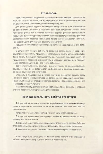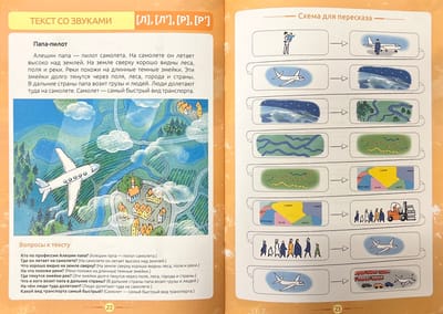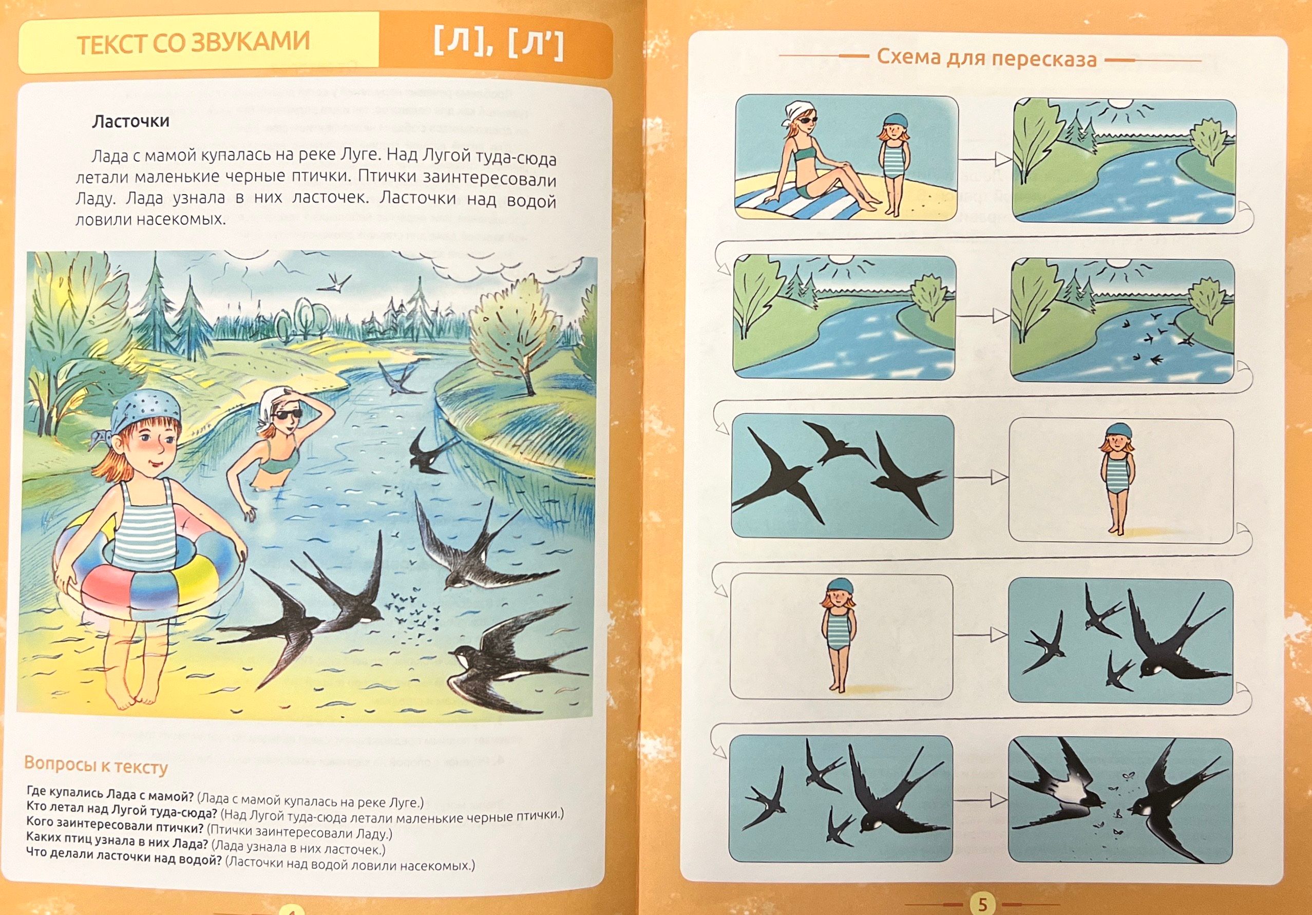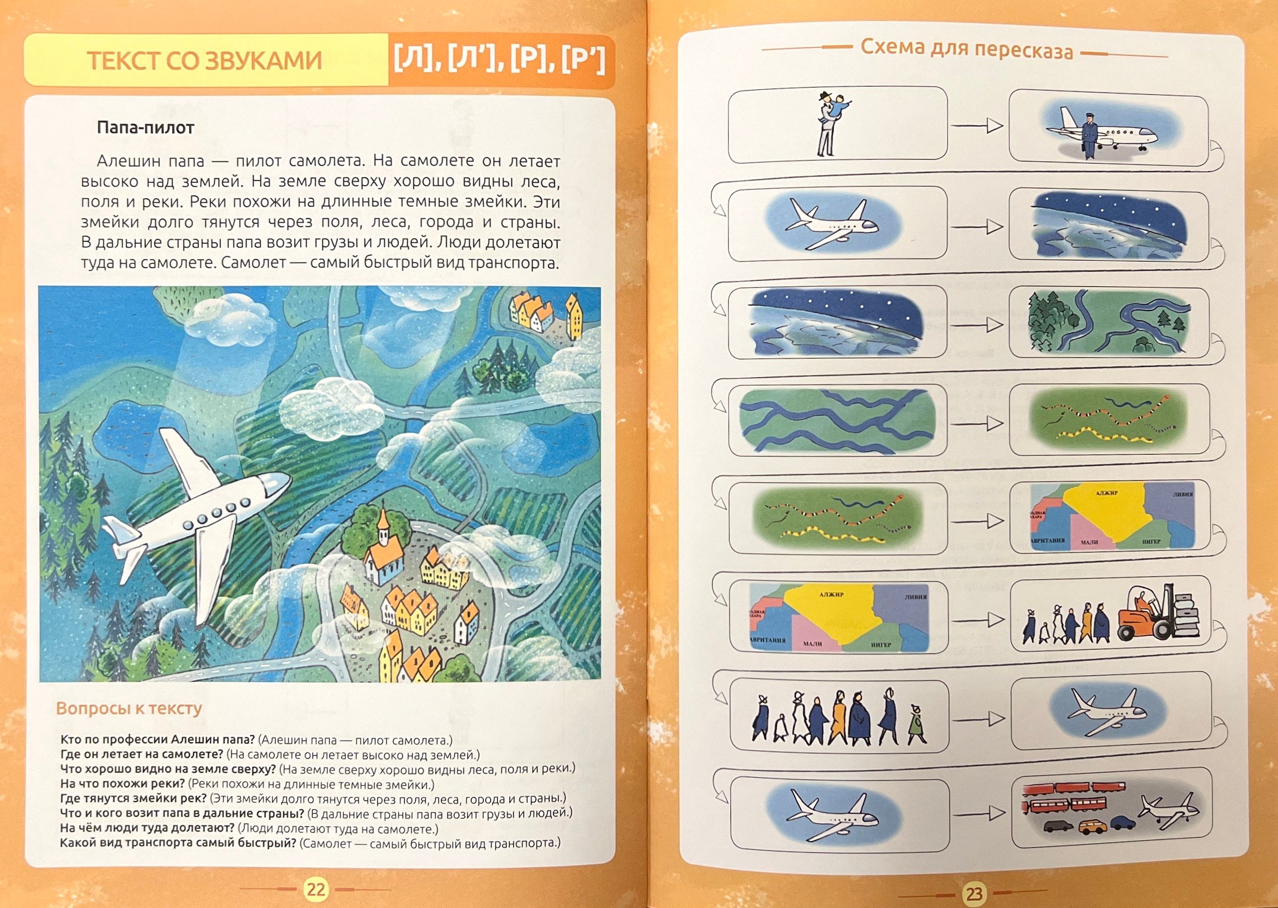 The notebooks contain texts of chain structure, questions for conversations on them and reference schemes with subject pictures for retelling. The texts are also designed to automate the correct pronunciation of Russian language sounds. This notebook contains stories for automating sonorant sounds.