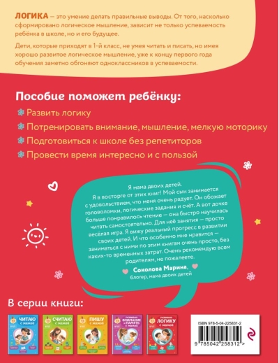 This educational resource is ideal for children aged 4, 5, and 6, as it takes into account their unique perceptions and interests. We also recommend purchasing other books in the series: “Reading with Mom,” “Counting with Mom,” “Writing with Mom,” and “Developing Attention and Memory with Mom.”